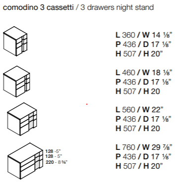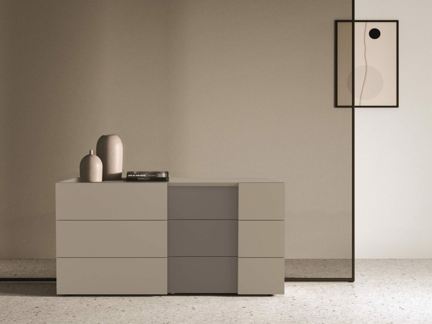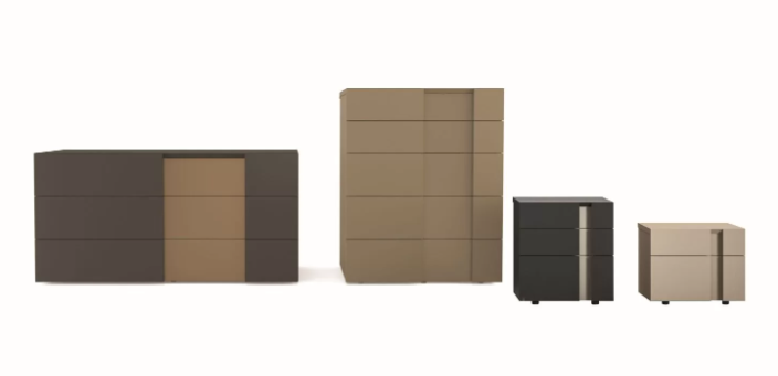 Спальный гарнитур с матово-лакированными деревянными панелями. Фасады выдвижных ящиков из МДФ, напротив, имеют специальную вертикальную вставку, которая может быть выполнена в матовом лаке, стандартном металле или дереве. Они открываются с помощью утопленной ручки спереди.