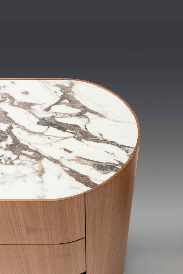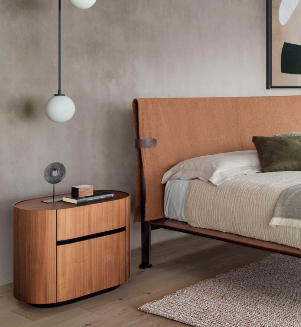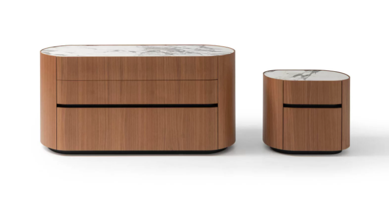 Комоды и прикроватные тумбочки мягких округлых форм идеально сочетаются с одноименной кроватью.