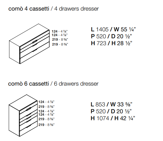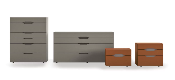 Спальный гарнитур отличается линейностью элементов, которая, однако, выделяется особым графическим оформлением утопленной ручки — детали, придающей динамичность фасадам выдвижных ящиков. Ручка может сочетаться с фасадом или контрастировать с ним, чтобы подчеркнуть его привлекательность и создать интересную игру цветов. Здесь есть комоды, прикроватные тумбочки, а также практичный высокий шкаф с шестью выдвижными ящиками, который идеально подходит для оптимизации вертикального пространства.