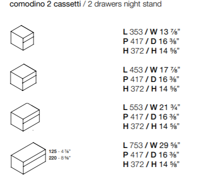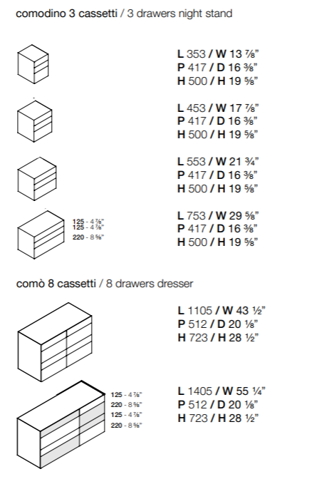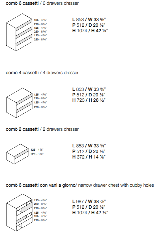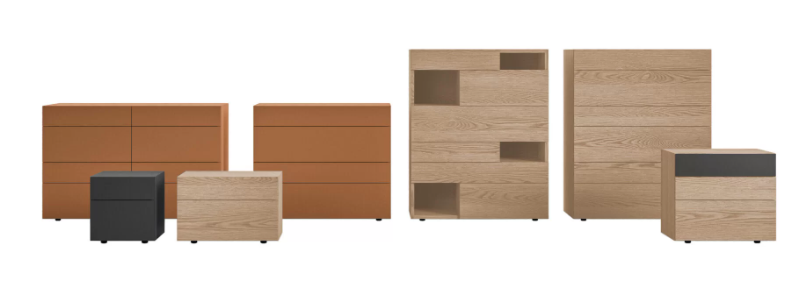 Спальный гарнитур с деревянными панелями из стружки, может быть покрыт матовым лаком или отделан деревом. С другой стороны, строгие объемы комода дополняются наличием открытых отделений различных форм и размеров, которые придают мебели визуальную оригинальность и динамизм, тем самым персонализируя пространство для хранения. Выдвижные ящики открываются с помощью боковой ручки.