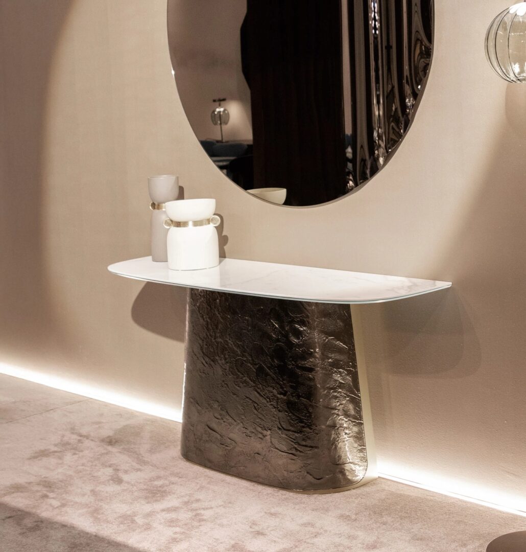 Каждая комната возрождает исключительную красоту с консольным столом Adone, который сочетает в себе скульптурную эстетику с драгоценной отделкой ручной работы: Adone удивляет смелым сочетанием естественности верха в различных отделках и драгоценности основания из изогнутого стекла bocciardato и ретро посеребренного, в бронзовых или черных цветах.