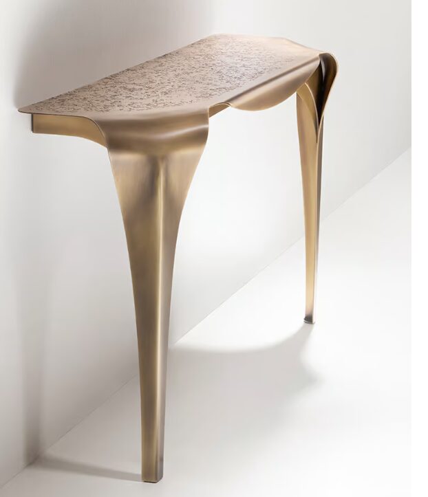 Консоль Convivium, вдохновленная одноименным столом, изящно прислоняется к стене. Эта модель, полностью выполненная из латуни, выделяется плавным движением изогнутых ножек.