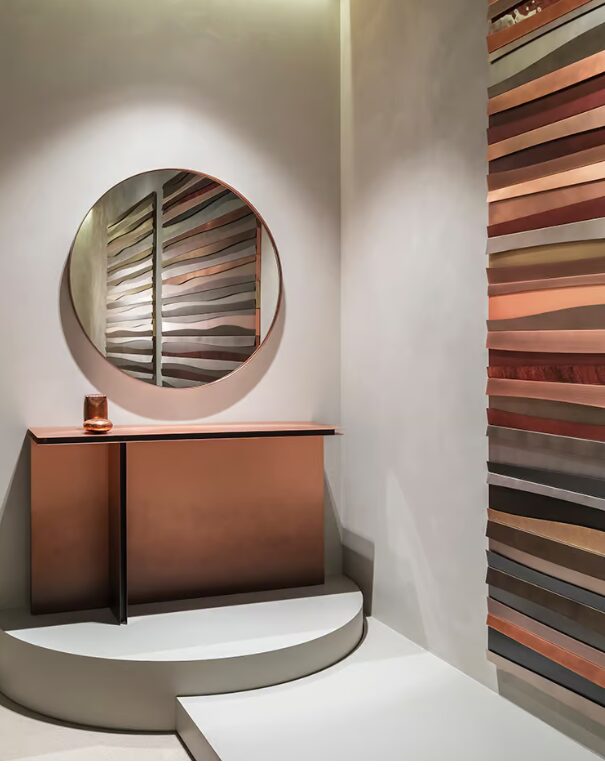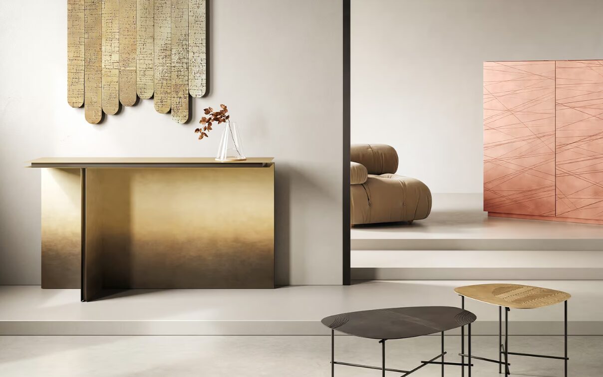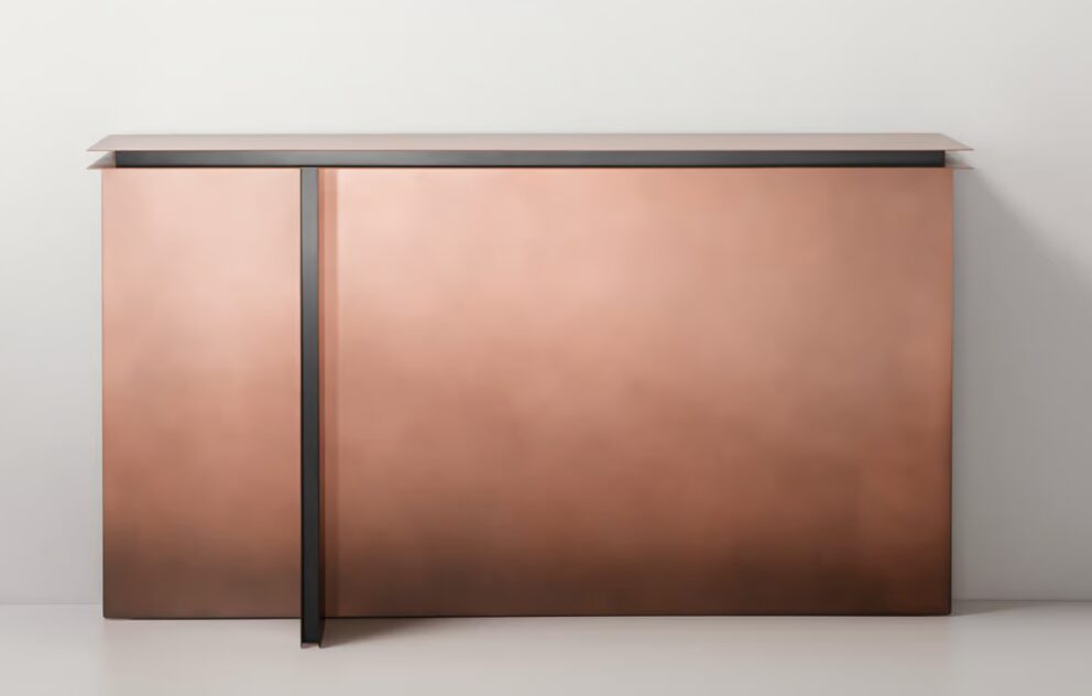 Folio — это дизайнерская консоль, изготовленная из толстых латунных листов, расположенных в параллельных плоскостях, эксклюзивный архитектурный проект.