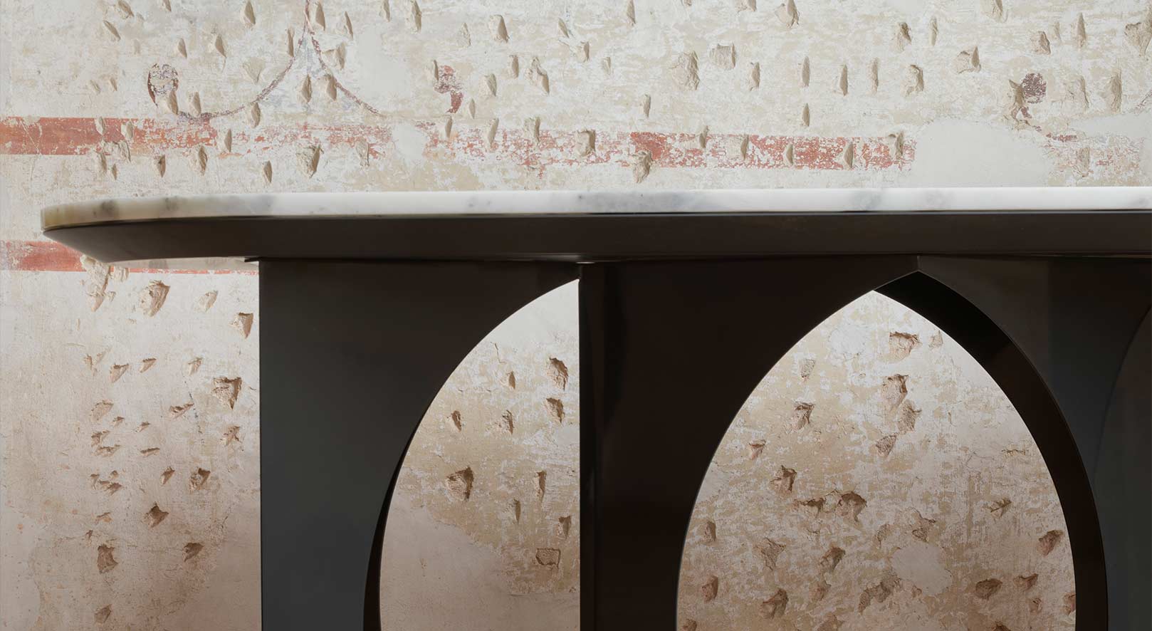 Ритмичная последовательность арок, в которой сочетаются элементы архитектуры и дизайна. Воздушная отделка рамы выполнена из матового металла, визуально контрастирующего с матовыми вставками из натуральной латуни.
