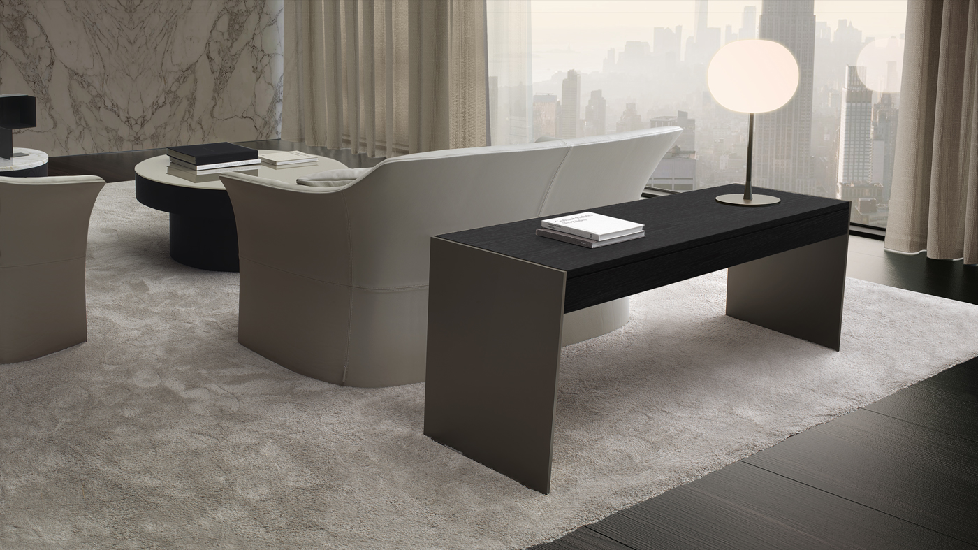 Консоль Milano, как и письменный стол в коллекции, создает утонченный образ с характером. Эклектичный и универсальный предмет мебели, который можно свободно размещать в интерьерах, придавая им особую скульптурность. Для прихожей, также размещенной рядом с обеденным столом или рядом со спинкой дивана подходящей высоты, его решительная индивидуальность элегантно находит свое место в жилых интерьерах и гостиничном бизнесе. Он доступен как с лакированной поверхностью Ral, так и с темно-коричневой отделкой из розового дерева Santos, а также в вариантах с обивкой из кожи или седельной кожи. Конструкция моста, сохраняющая легкость дизайна, состоит из двух металлических лопастей, соединенных по бокам к верхней части с отделкой из темной бронзы или светло-золотого солнечного света.