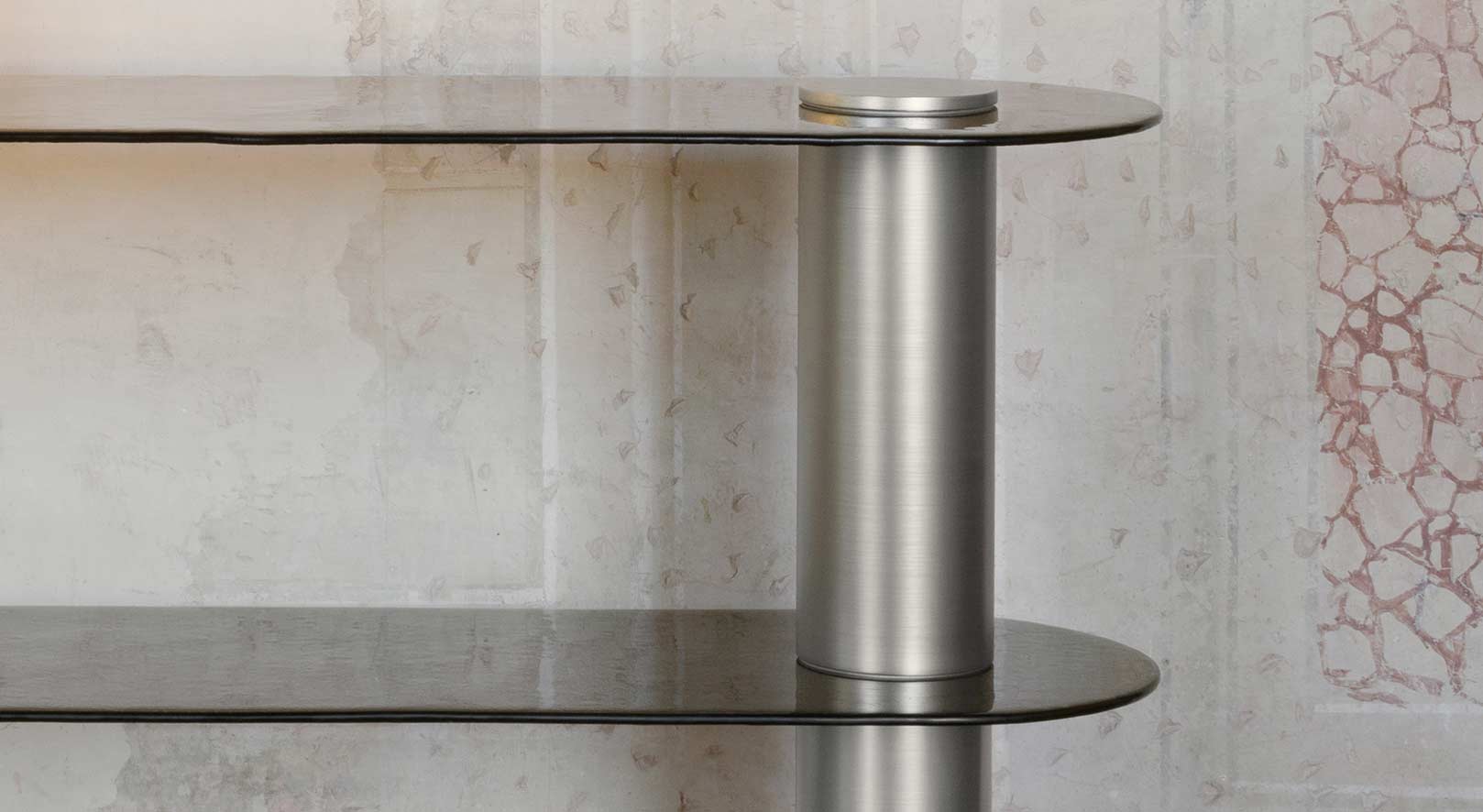Модель, состоящая из скульптурных форм. Массивные колонны, детали полок и контраст между рельефным стеклом и металлической отделкой отражают суть современного образа жизни.