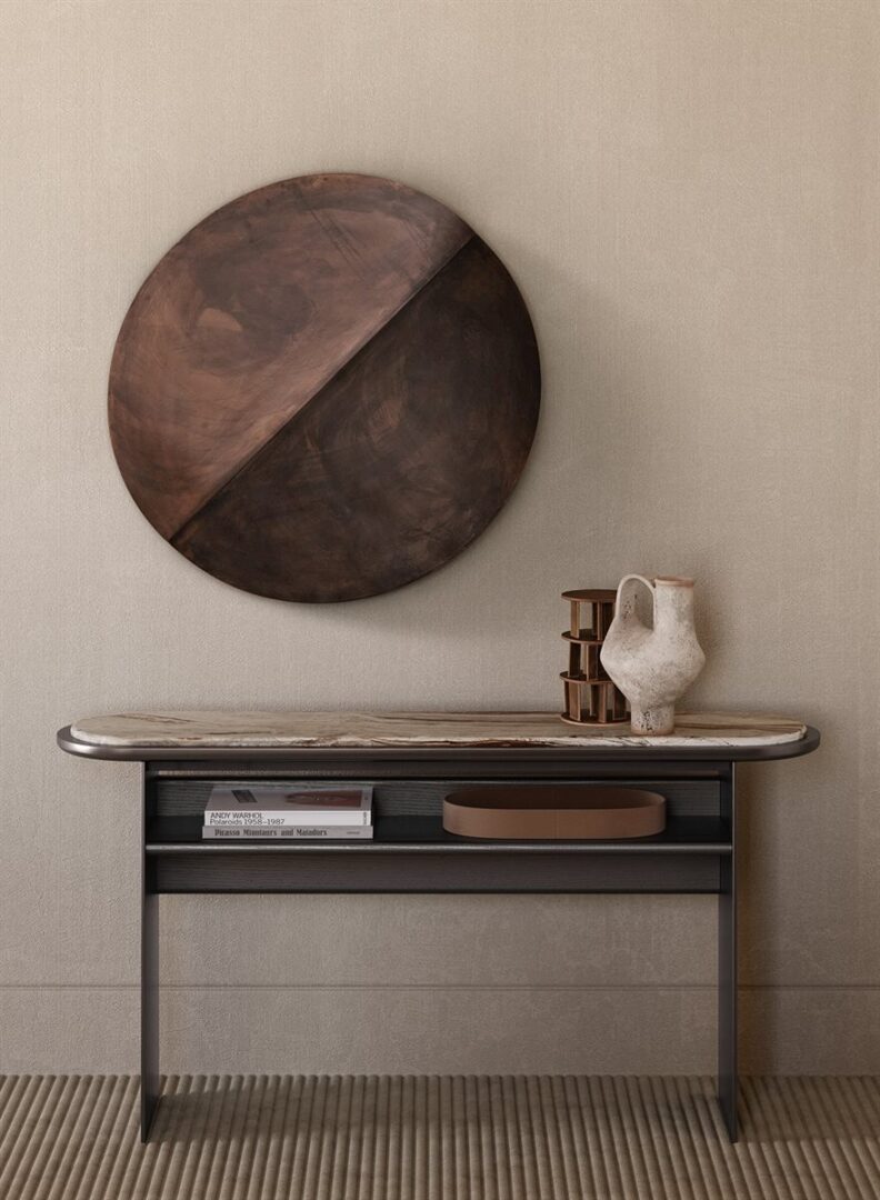 Консоль с металлическим каркасом и лакированной деревянной столешницей «deep black». Полка и спинка из ясеня, окрашенного в черный цвет. Доступна версия с металлическим каркасом и деревянной столешницей с матовым лаком «песок Нила». Полка и спинка из ясеня, окрашенного в» чистый » белый цвет с открытыми порами.