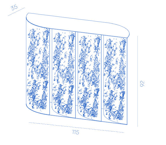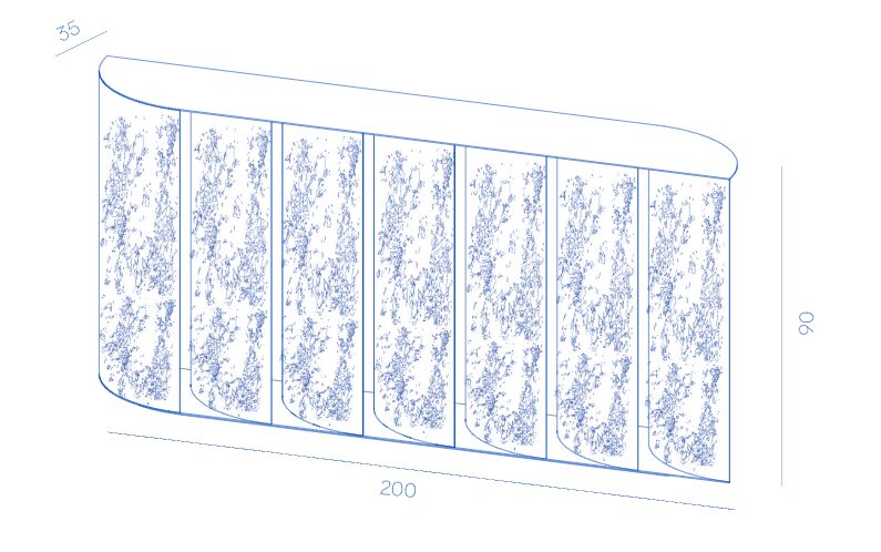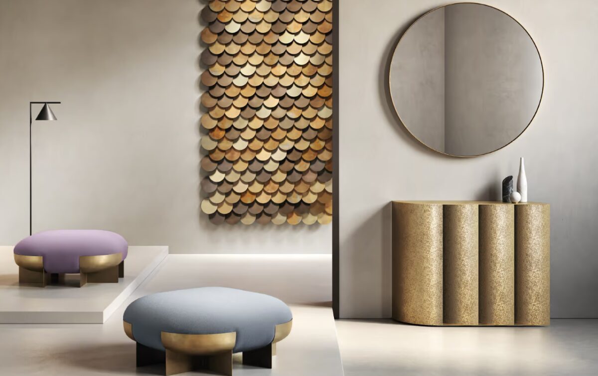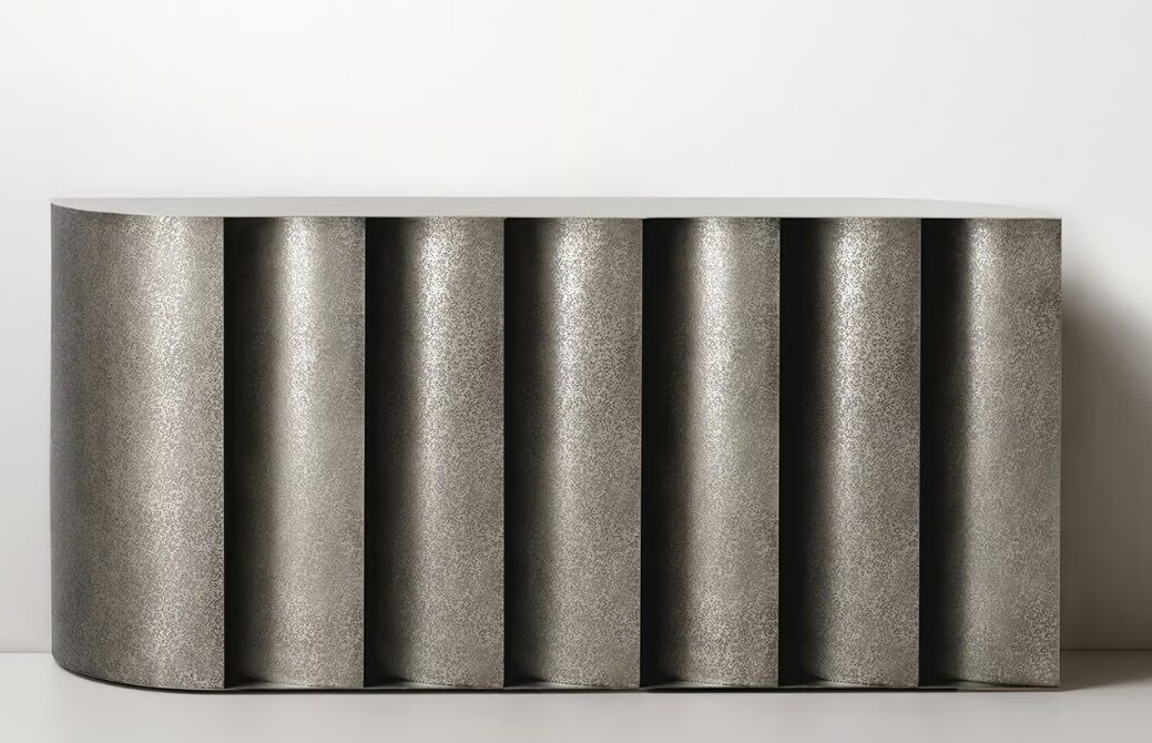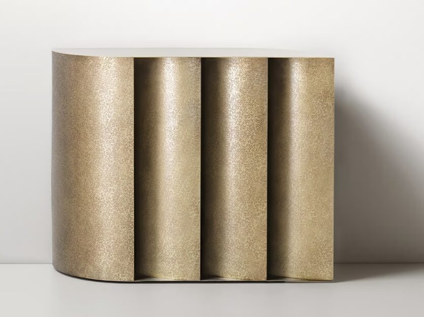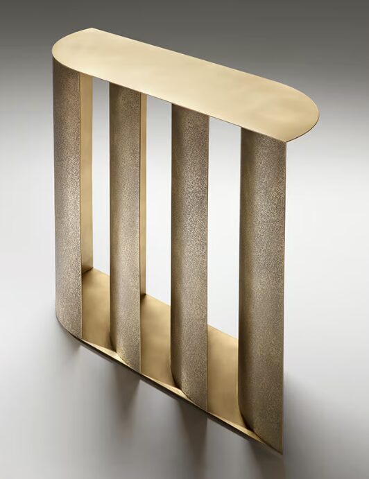 Серия изогнутых латунных листов образует основу консоли Sinestesia, подчеркивая прочность и выразительность этого благородного материала.