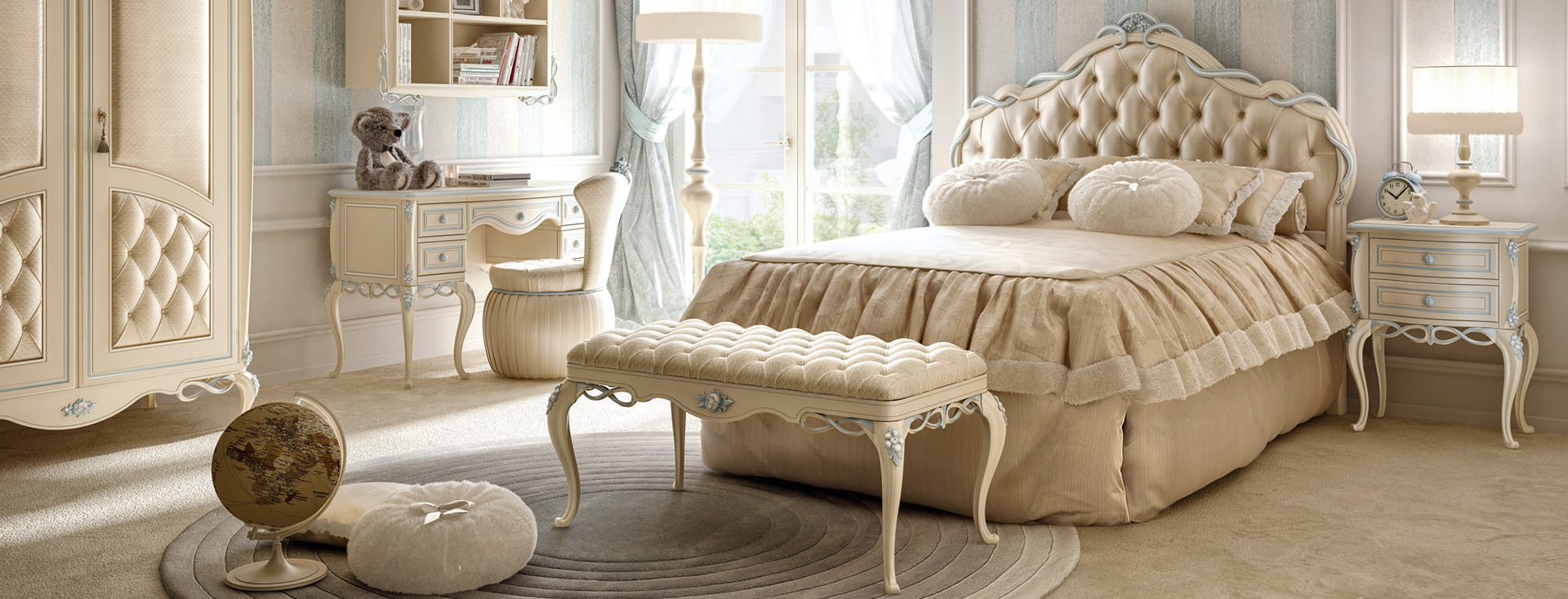 Драгоценные золотые ленты мягко обвивают каркас этой кровати, придавая ей особую изысканность. Изголовье, искусно обтянутое лучшими мастерами, дарит уют и комфортное тепло. Ничто не забыто и не оставлено на волю случая: основание кровати, одинаково отделанное и тщательно проработанное, придает ей солидности и очаровательной женственности. В единственном варианте, выполненном в пастельных тонах, он становится главным героем детской спальни, превращая ее в волшебное место, где живут самые волшебные сказки, неподвластные времени. Дополняющий коллекцию набор coordinated — это полное воплощение идеи “Forever”: мечта, поистине неподвластная времени и пространству.