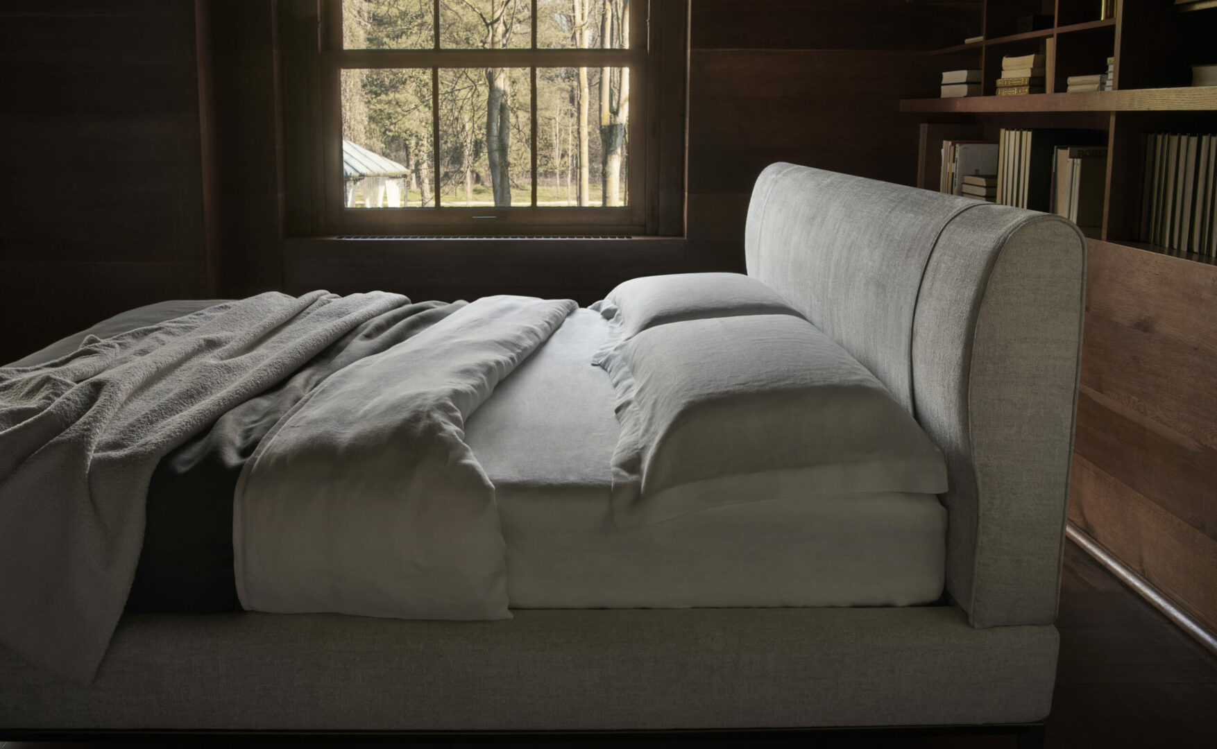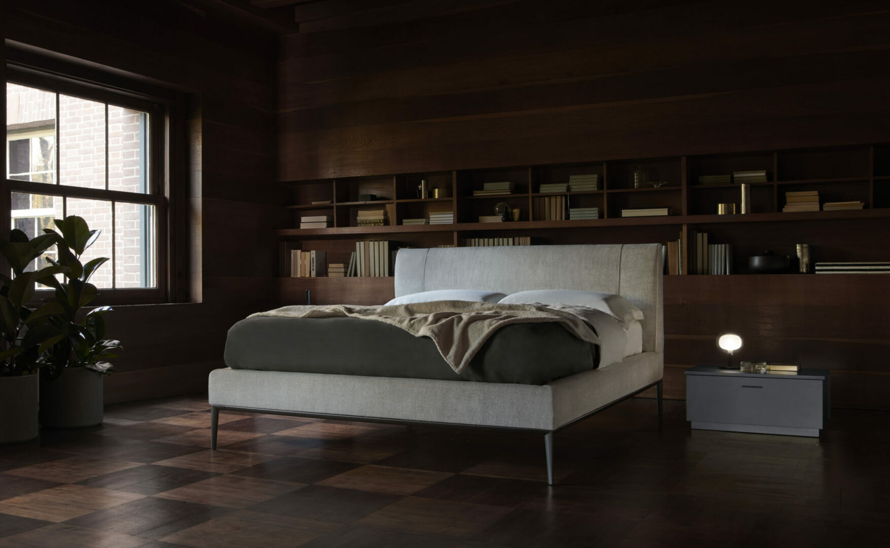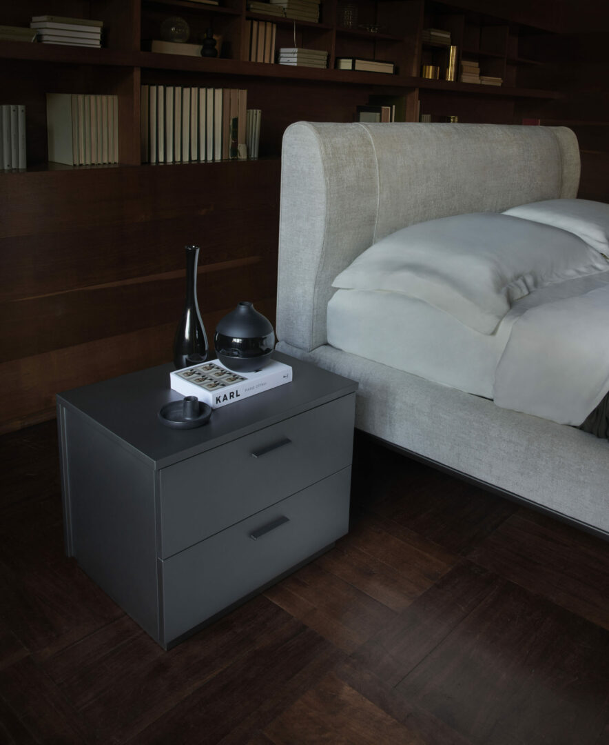 Кровать AVENUE, спроектированная архитектором Джо Гарзоне (Joe Garzone), отличается удобным и стильным изголовьем с мягкой обивкой, украшенным строчкой на изголовье. Основание изготовлено из литого под давлением металла и доступно в двух различных цветах.