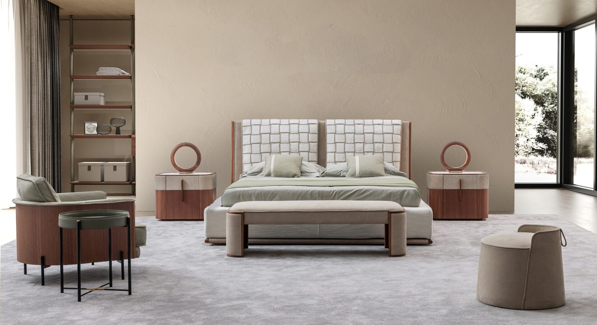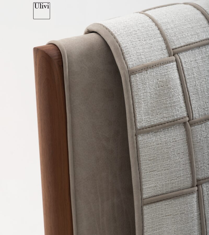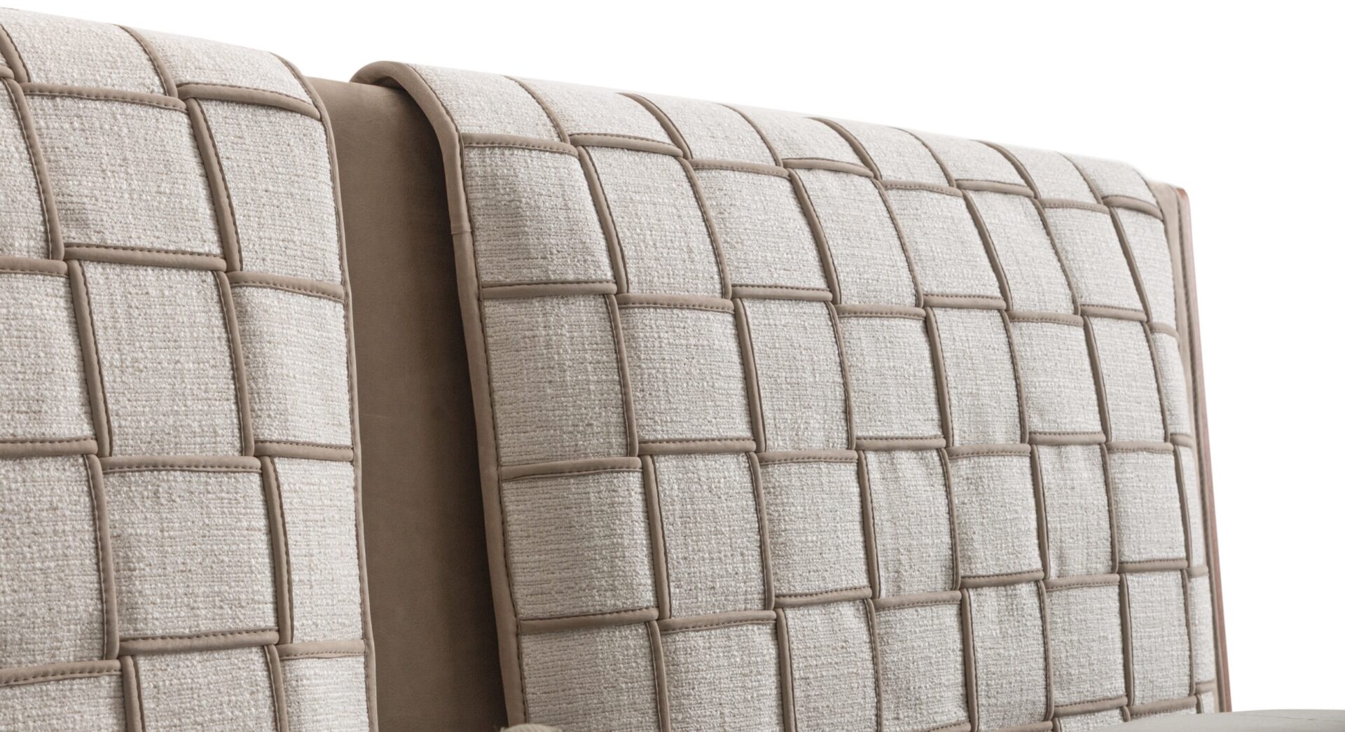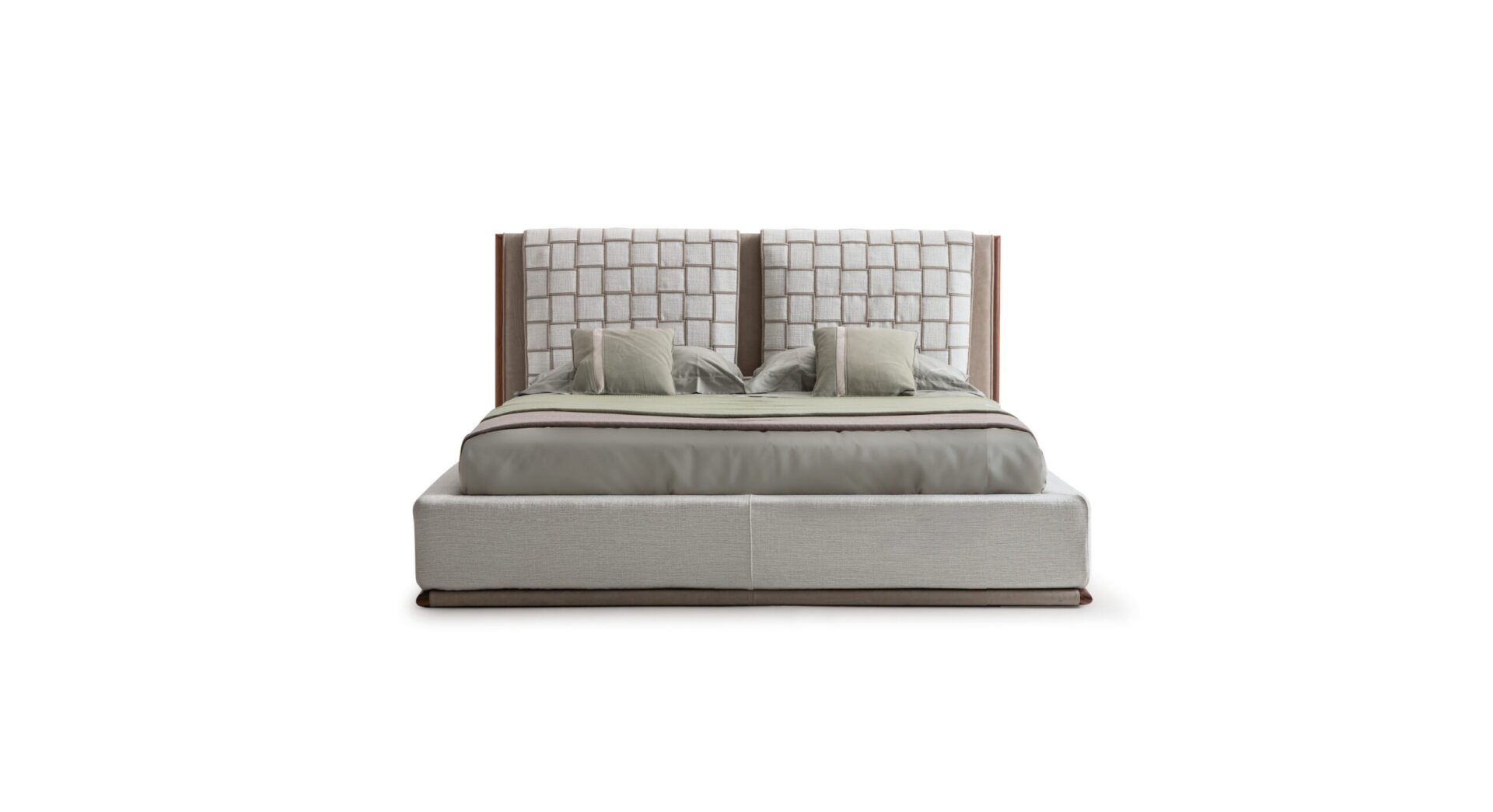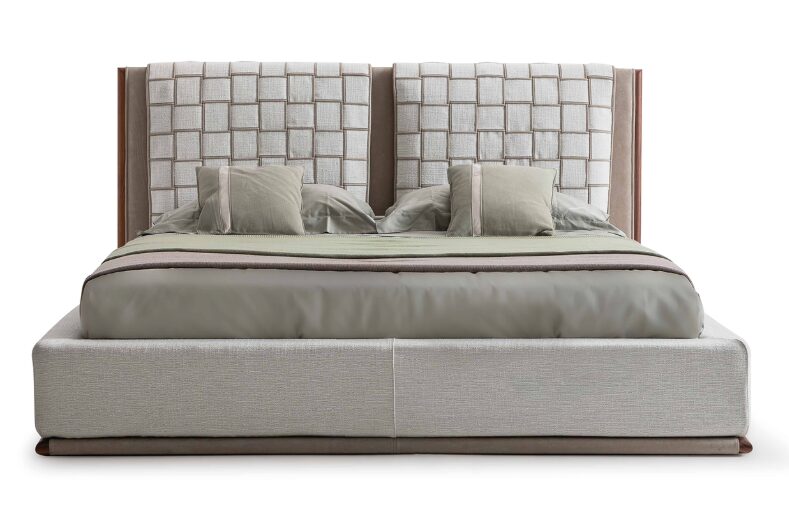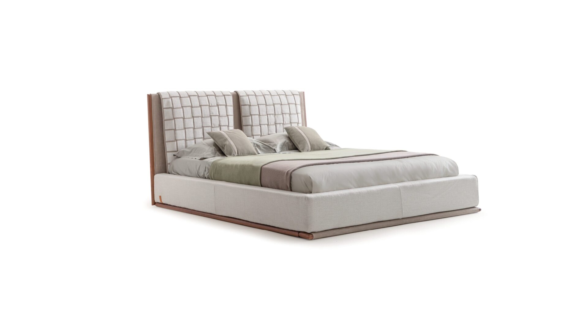 Clay-это кровать, сочетающая в себе элегантность и текстурную теплоту, с изголовьем, характеризующимся рамой из массива американского ореха, обрамляющей две подушки для подголовника, выполненные из изысканной оплетки из кожи и ткани, подписанной оливковыми гостиными.