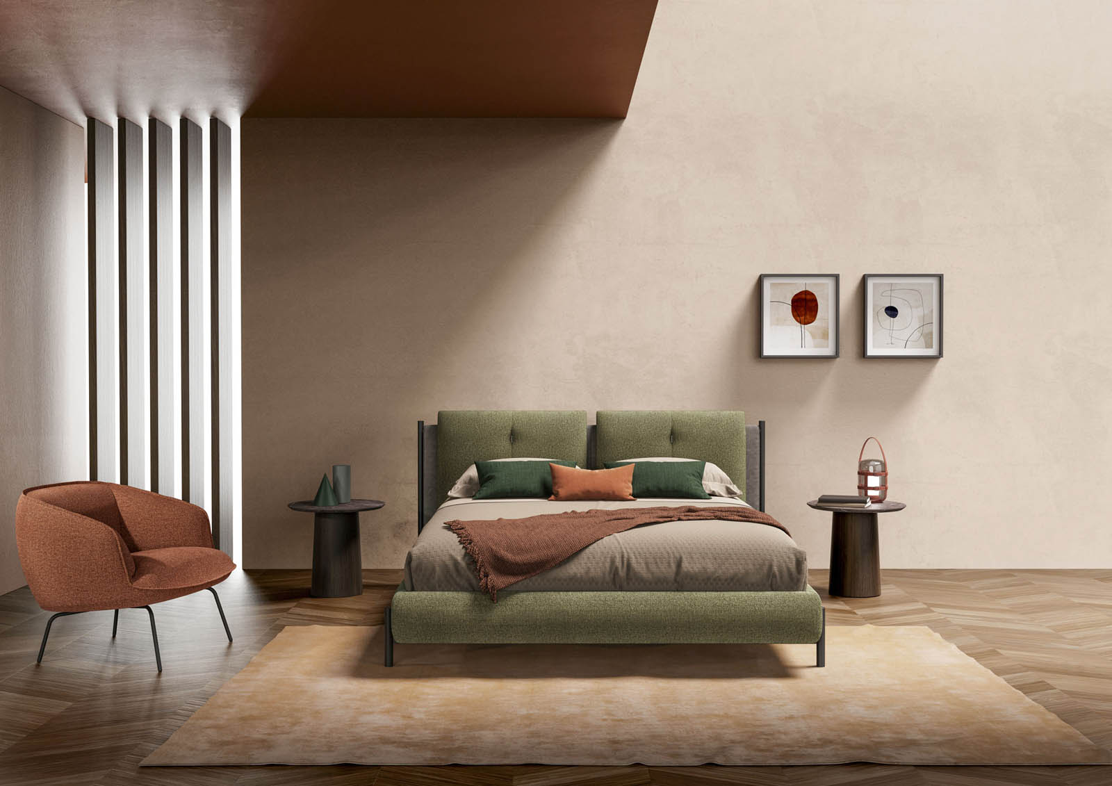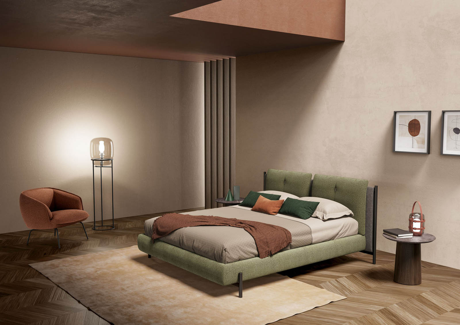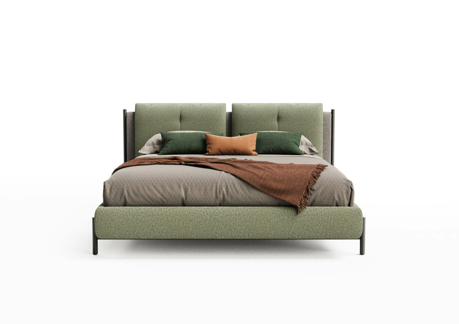 Твердые ноты обусловлены металлическими элементами, которые украшают боковые стороны изголовья кровати, придавая ощущение солидности и решительности общему дизайну. Та же убежденность проявляется и в ножках рекомендованной конфигурации, которые создают приятную визуальную гармонию.