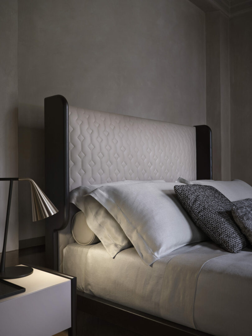 Кровать HUGS, спроектированная архитектором Джо Гарзоне (Joe Garzone), отличается элегантными и лаконичными линиями, округлой структурой из массива дерева и деталями из бронзированной латуни. Стеганая обивка доступна в различных вариантах из ткани или кожи.