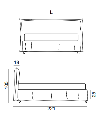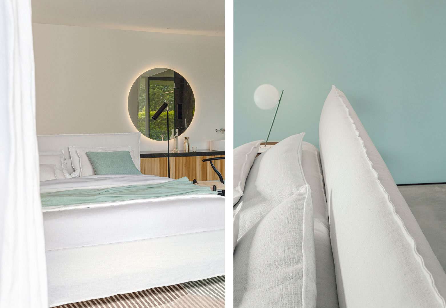 Очень современный проект, который сочетает в себе мягкое и деконструированное изголовье с оборчатыми или обтянутыми царгами.