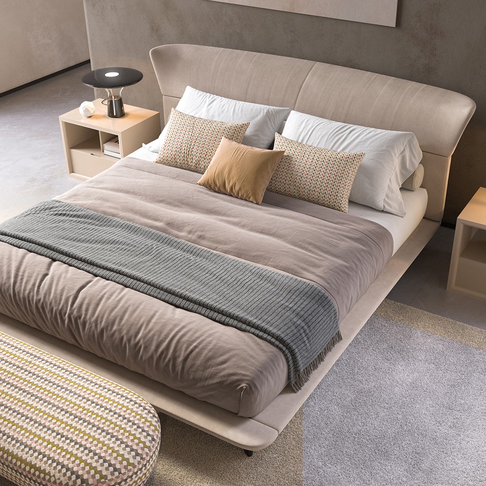 Кровать, обитая нубуком или тканью. Доступны в различных размерах.