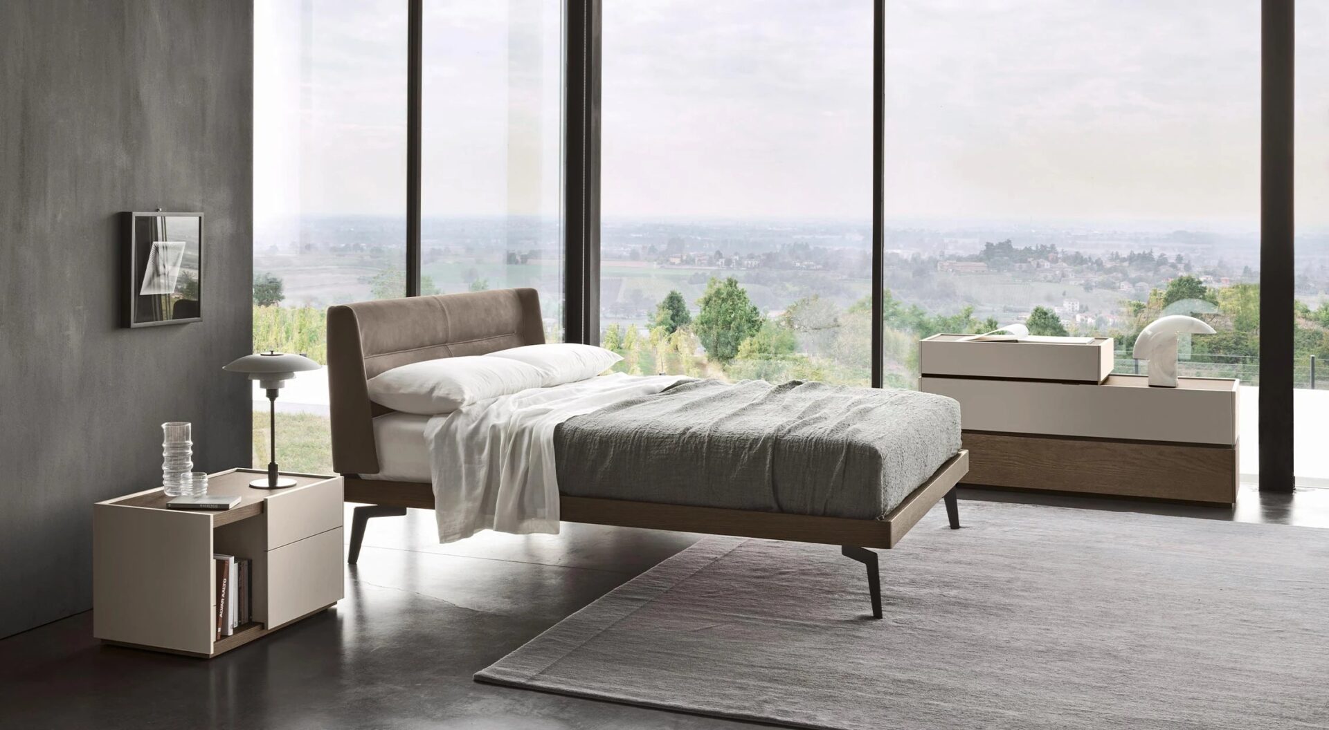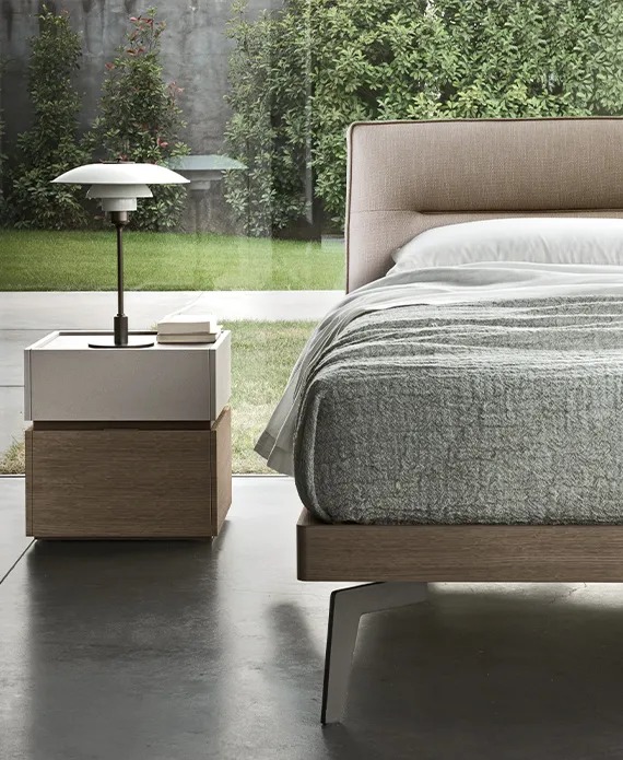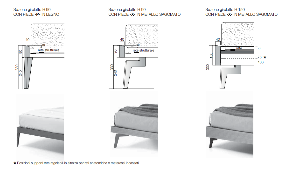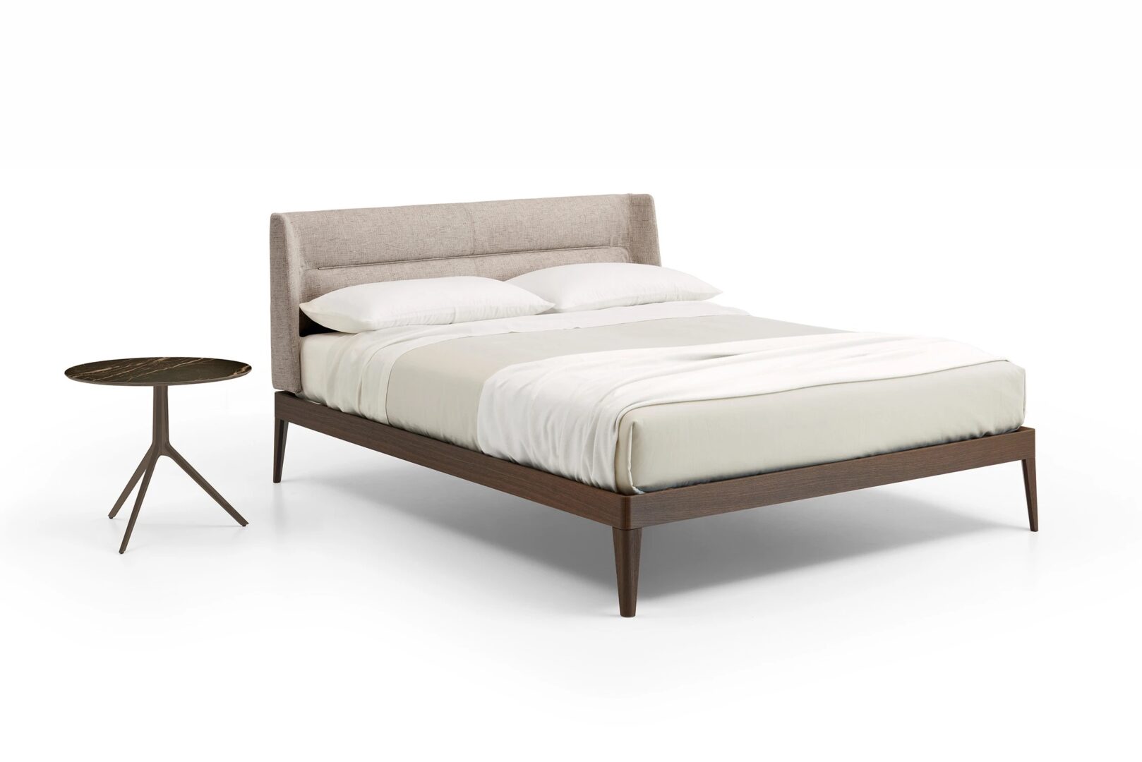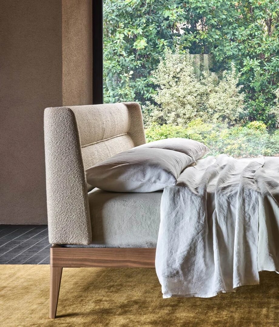 Богатство строительных деталей характеризует эту кровать, каркас кровати которой может быть деревянным или матовым лаком, с направляющими H 90 мм и опорой на землю на деревянных ножках.