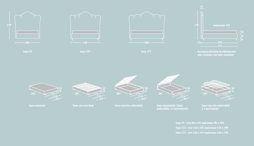 Версии: двуспальная кровать, одна с половиной квадрата и односпальная кровать, с основанием sommier или, основание с ящиком и фиксированной сеткой с деревянными рейками или, основание с ящиком и подъемной сеткой с деревянными рейками (полезное пространство h см 20) или, основание с 2-ходовой деревянной рейкой с ящиком. Рекомендуемые матрасы: 160×190 (двуспальная кровать), 120×190 (полтора квадрата) и 80×190 (одноместный). Структура: твердая древесина и ее производные. Набивка: пенополиуретан с разносторонними размерами, полиэфирные волокна. Особенности: полностью съемный; по специальному запросу все основания с сеткой могут поставляться в съемной версии (за дополнительную плату) или двуспальная база может быть разделена на две части (за дополнительную плату).