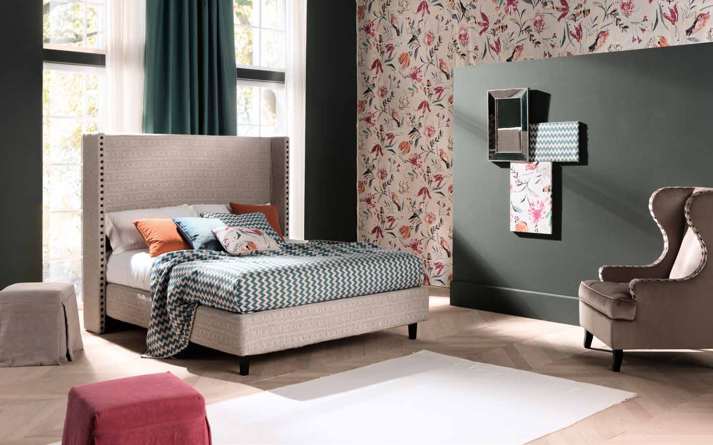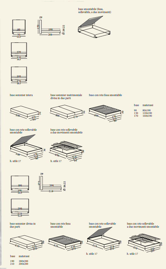 основание с ящиком и деревянными решетчатыми решетками или, основание с коробкой и подъемной сеткой с деревянными рейками (полезное пространство h 17 см) или основание с деревянной решеткой 2-ходовой подъемный с коробкой. Рекомендуемые матрасы: 80×190 (односпальная кровать), 120×190 (одна квадратная кровать 160×190 (двуспальная кровать), 180×200 (кровать XL), 200×200 (кровать XXL). Структура: деревянный массив и его производные. Обивка: полиуретан вспененный до разносторонних размеров, полиэфирные волокна. Особенности: шпильки на изголовье доступны в цветах и типы согласно каталогу; все основы с сеть поставлены в съемной версии; основание двухместный sommier, XL и XXL поставляется разделенным на две части .
