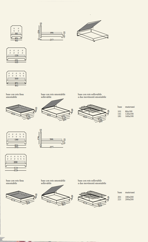 Версии: односпальная кровать, полуторная кровать, Кровать двухместный, XL, XXL с базой sommier или основание с ящиком и деревянными решетчатыми решетками или, основание с ящиком и подъемной сеткой с деревянными рейками (полезное пространство h 20 см) или основание с 2-ходовой деревянной решеткой лифт с коробкой. Рекомендуемые матрасы: 80×190 (односпальная кровать), 120×190 (полуторная кровать), 160×190 (двуспальная кровать), 180×200 (кровать XL), 200×200 (кровать XXL). Структура: твердая древесина и его производные. Обивка: пенополиуретан a дифференцированные квоты, полиэфирные волокна. Характеристики: полностью покрытый кнопками на изголовье; все основания с сеткой поставляются в съемной версии.