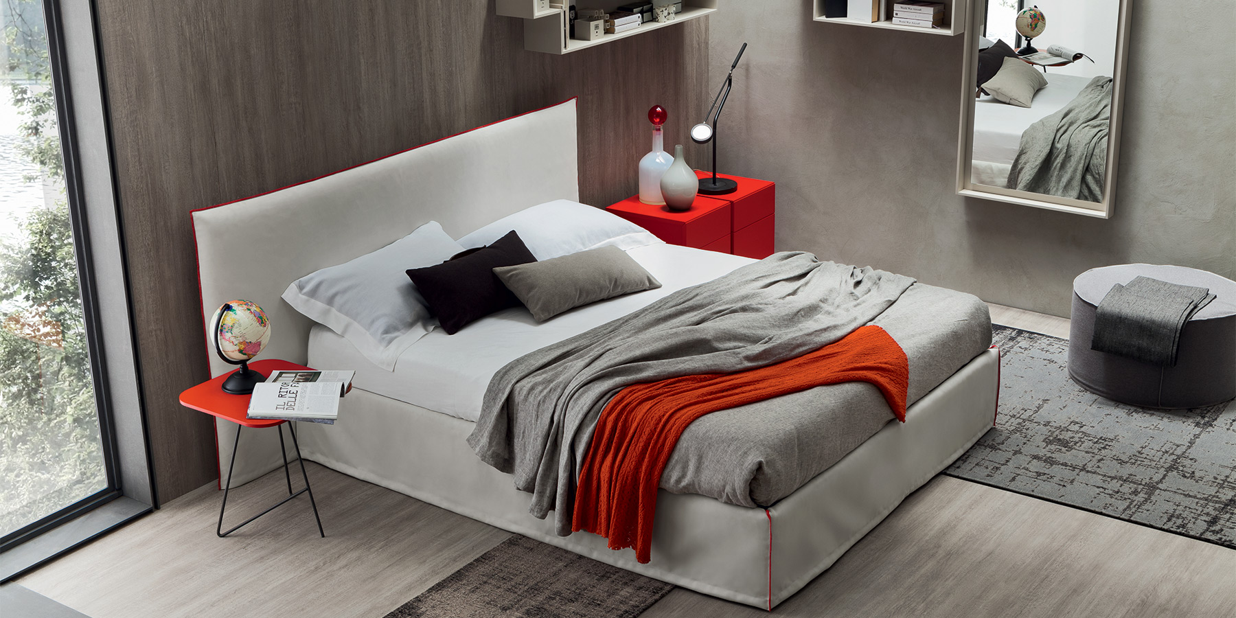 Изголовье кровати украшено оверлочной строчкой, которая проходит по краю с трех сторон и подчеркивает форму кровати. Элегантная и в то же время динамичная деталь пошива в красном цвете rosso идеально сочетается с матовыми губами rosso из коллекции Brio.