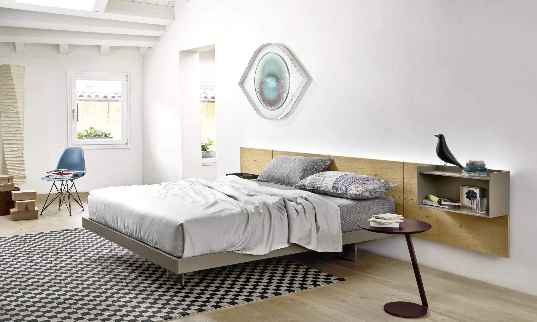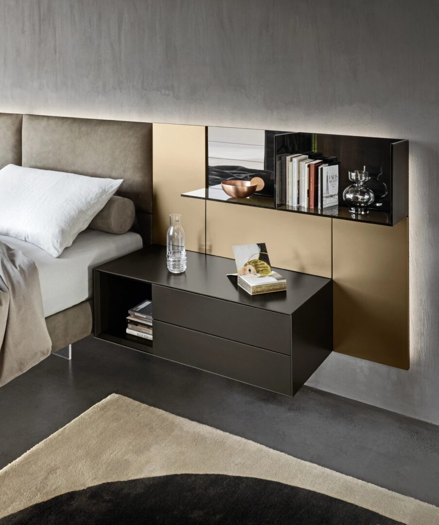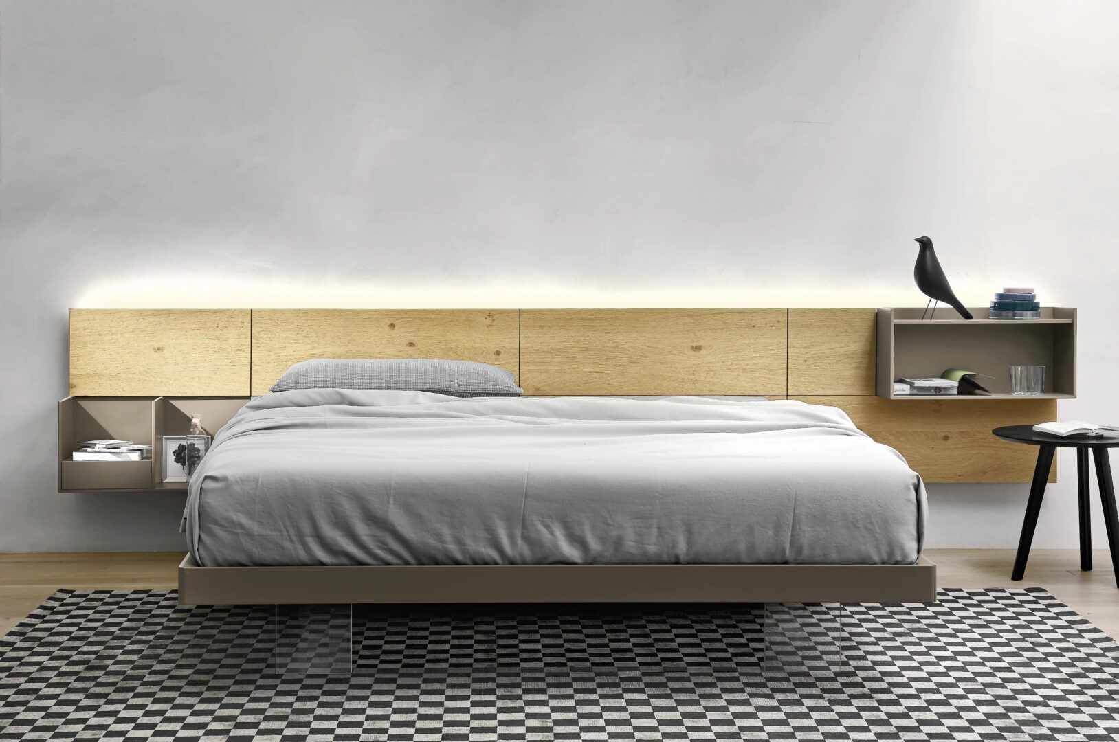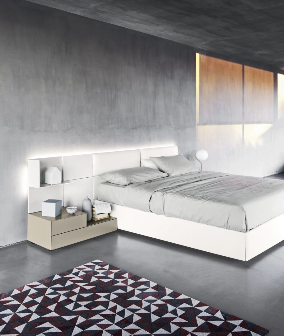 Универсальная система кроватей, характеризующаяся изголовьем, состоящим из обшивки или деревянных панелей, которые развиваются сбоку, даже в сочетании с контейнерами и полками Domino.