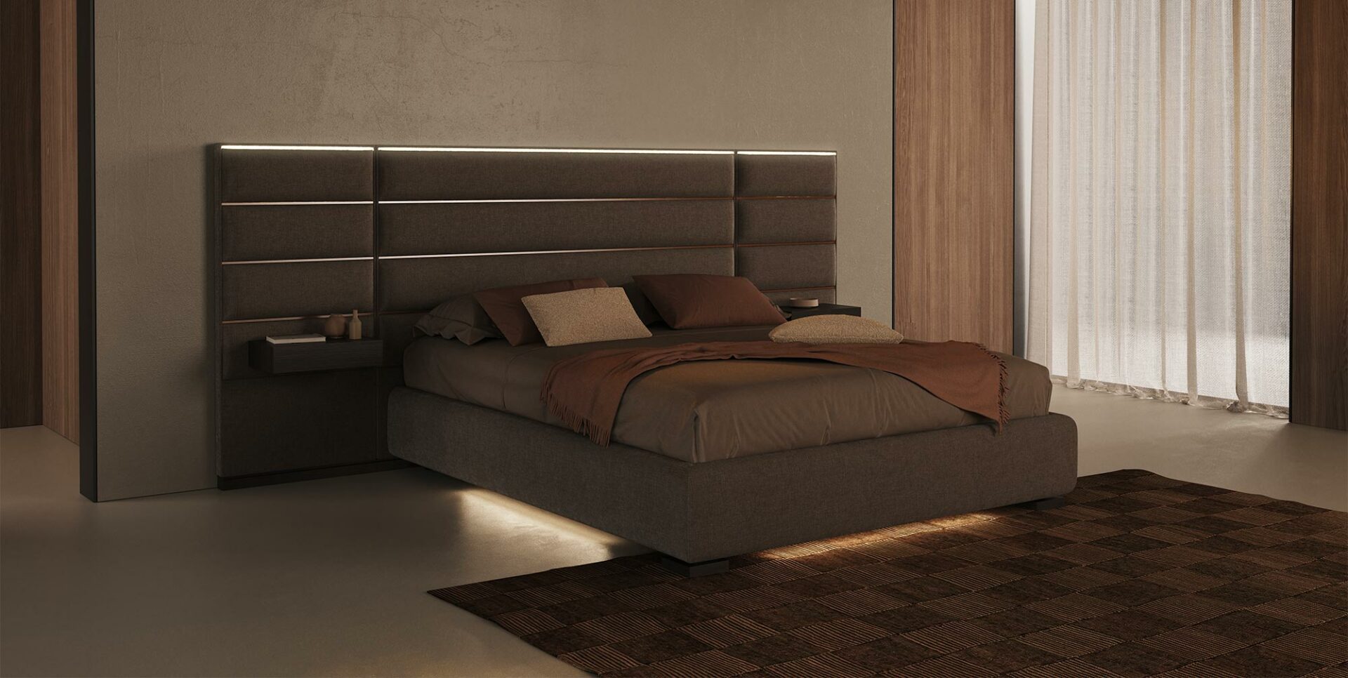 В Tamigi изголовье кровати может стать фоном и выходить даже за пределы конструкции кровати, благодаря боковым модулям, которые также могут быть дополнены выдвижными ящиками и консолями, дополняя пространство кровати всем необходимым.