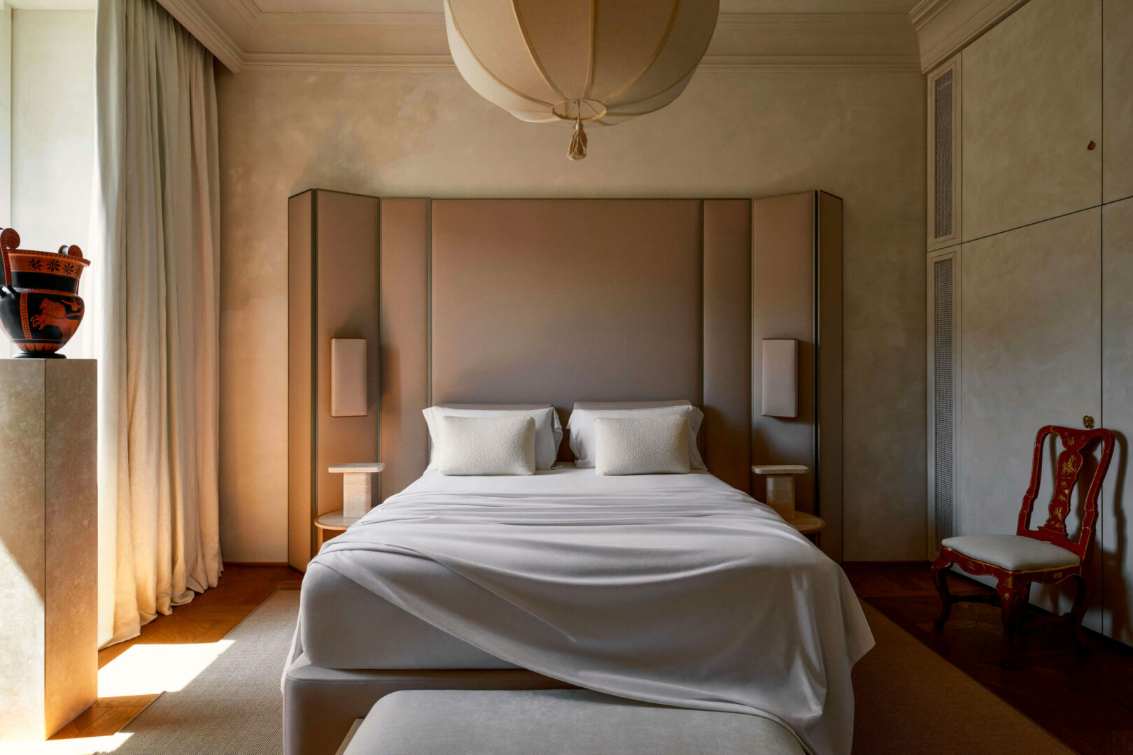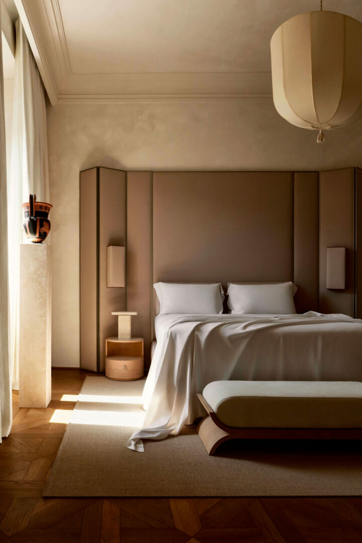 Кровать Tiberio, разработанная 13.1 Design, представляет спальную зону как пространство, которое должно быть гармонично оформлено и в котором можно жить. Изголовье кровати расширяется и становится настоящей домашней архитектурой: фоном, который окружает кровать и по-новому определяет взаимосвязь между мебелью и окружающей средой.
