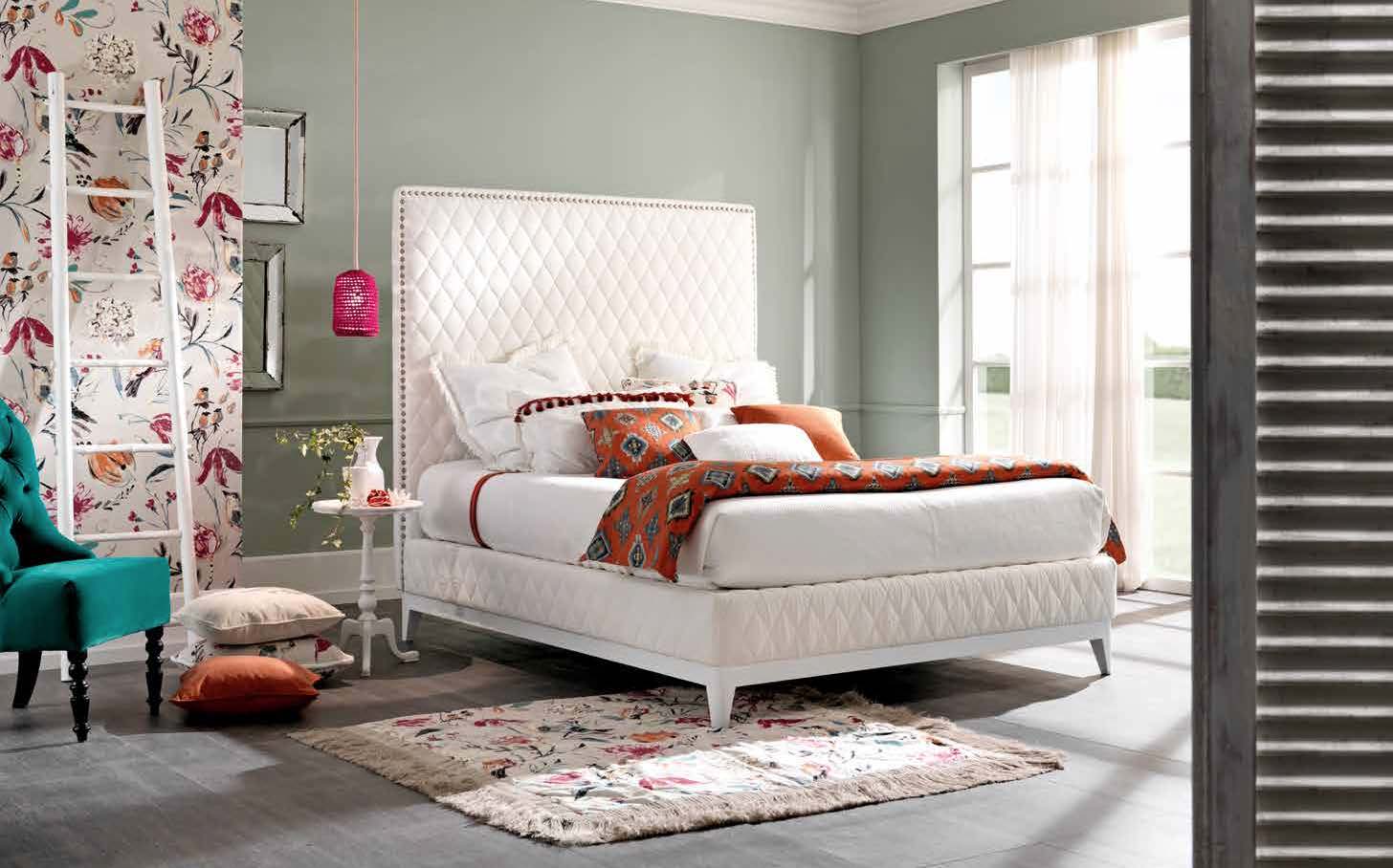 Версии: односпальная кровать, полуторная кровать, двуспальная кровать, XL, XXL с основанием sommier. Рекомендуемые матрасы: 80×190 (односпальная кровать), 120×190 (полуторная кровать), 160×190 (двуспальная кровать), 180×200 (кровать XL), 200×200 (кровать XXL). Структура: твердая древесина и ее производные. Обивка: пенополиуретан с разными размерами, волокна полиэфир. Особенности: изголовье с доступными гвоздями в вариантах и типах согласно каталогу; несъемное деревянное основание доступно в отделка согласно каталогу; база sommier двуспальная XL и XXL поставляется разделен на две части.