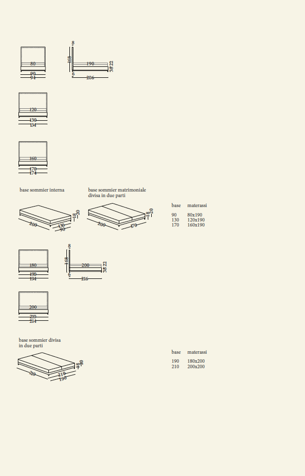 Указаны размеры рекомендуемых матрасов: 80×190 (односпальная), 120×190 (полуторная), 160×190 (двуспальная), 180×200 (XL), 200×200 (XXL). База sommier для двуспальных кроватей XL и XXL поставляется, разделённая на две части.