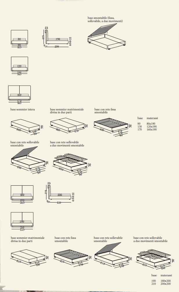 Версии: односпальная кровать, полуторная кровать, двуспальная кровать, XL, XXL с основанием sommier или, основание с ящиком и деревянными решетчатыми решетками или, основание с коробкой и подъемной сеткой с деревянными рейками (полезное пространство h 20 см) или основание с деревянной решеткой 2-ходовой подъемный с коробкой. Рекомендуемые матрасы: 80×190 (односпальная кровать), 120×190 (одна квадратная кровать 160×190 (двуспальная кровать), 180×200 (кровать XL), 200×200 (кровать XXL). Структура: деревянный массив и его производные. Обивка: полиуретан вспененный до разносторонних размеров, полиэфирные волокна. Особенности: полностью съемный, изголовье из версии односпальная кровать и полутора квадратных это Весь; все базы с сетью предоставляются в версии съемный; основание sommier двойной, XL и XXL она разделена на две части.