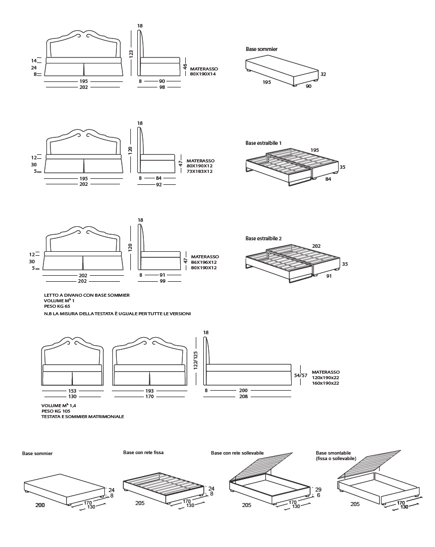 Версии: кровать, расположенная на диване с основанием sommier, с деревянной решеткой и второй кроватью выдвижной. Доступен в двух размерах.