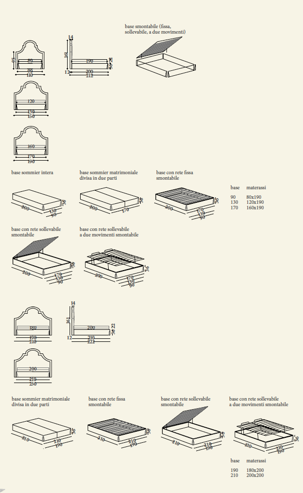 Версии: односпальная кровать, полуторная кровать, двуспальная кровать, XL, XXL с основанием sommier или, основание с ящиком и деревянными решетчатыми решетками или, основание с ящиком и подъемной сеткой с деревянными рейками (пространство полезная высота 20 см) или основание с деревянной решеткой a 2 подъемные движения с коробкой. Рекомендуемые матрасы: 80×190 (односпальная кровать), 120×190 (одна квадратная кровать 160×190 (двуспальная кровать), 180×200 (кровать XL), 200×200 (кровать XXL). Структура: деревянный массив и его производные. Обивка: полиуретан вспененный до разносторонних размеров, полиэфирные волокна. Характеристики: все базы с сетью предоставляются в версии съемный; двуспальная кровать sommier, XL и, конечно же, она разделена на две части.