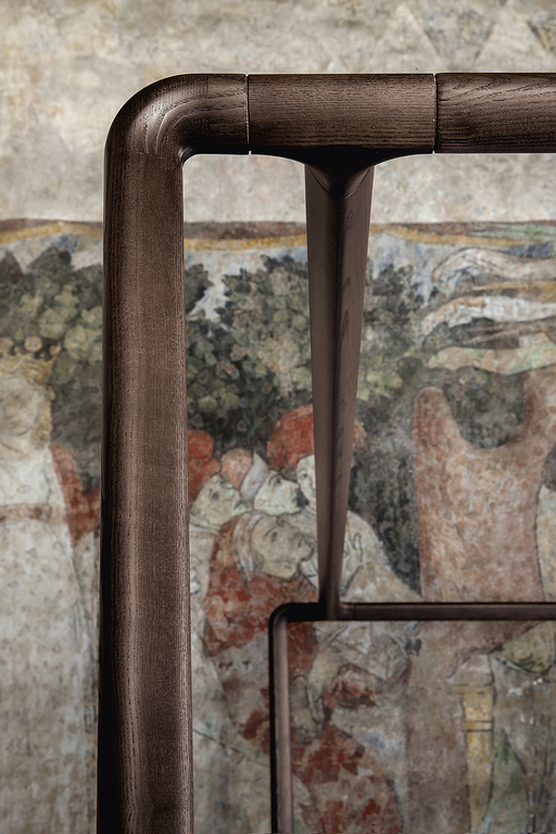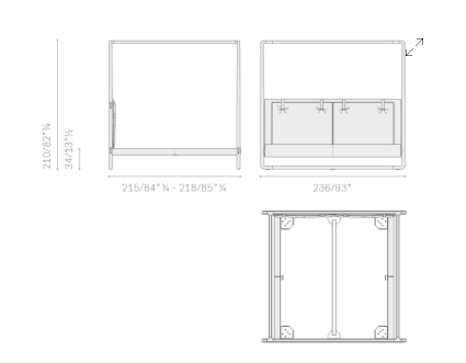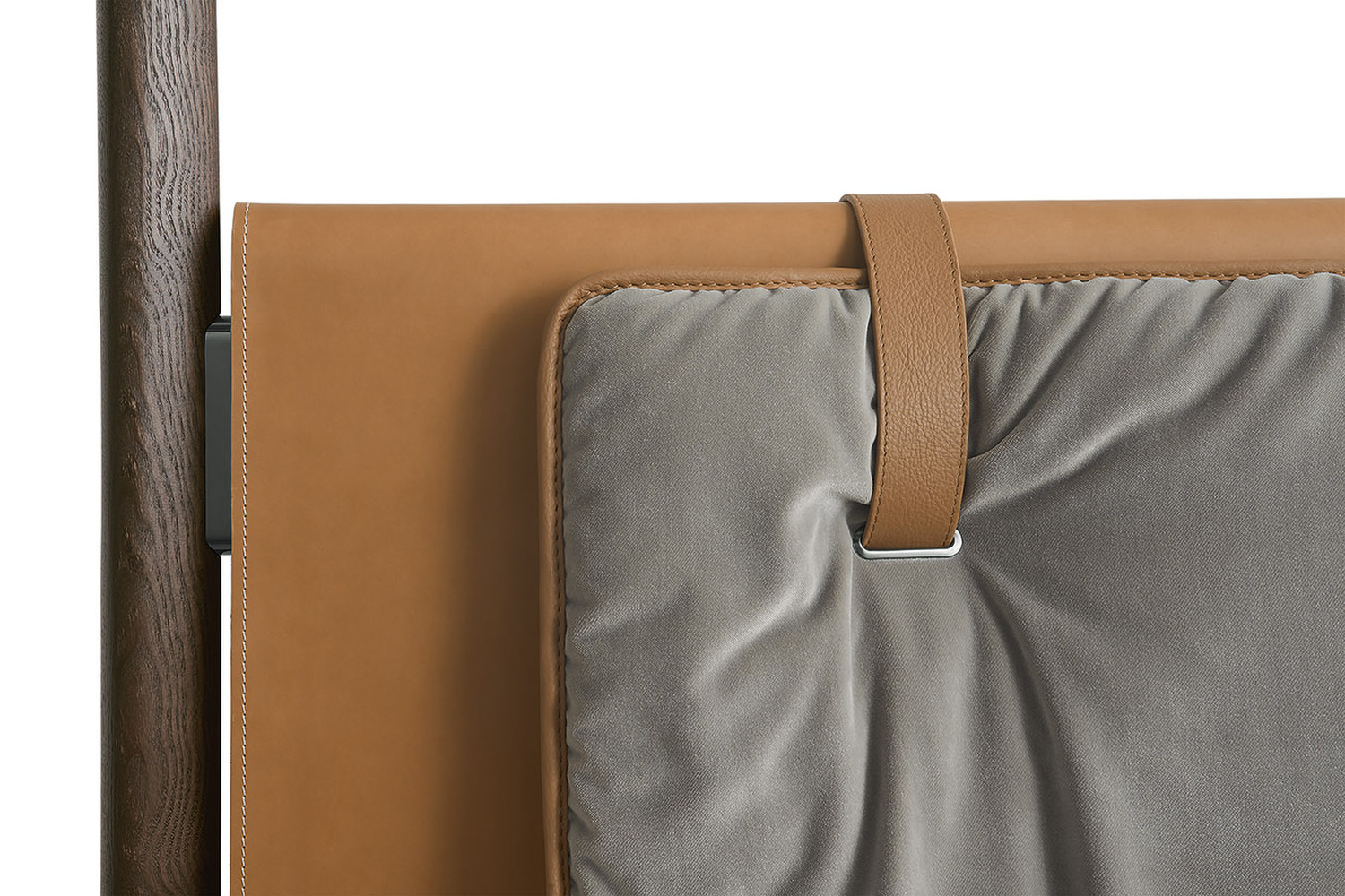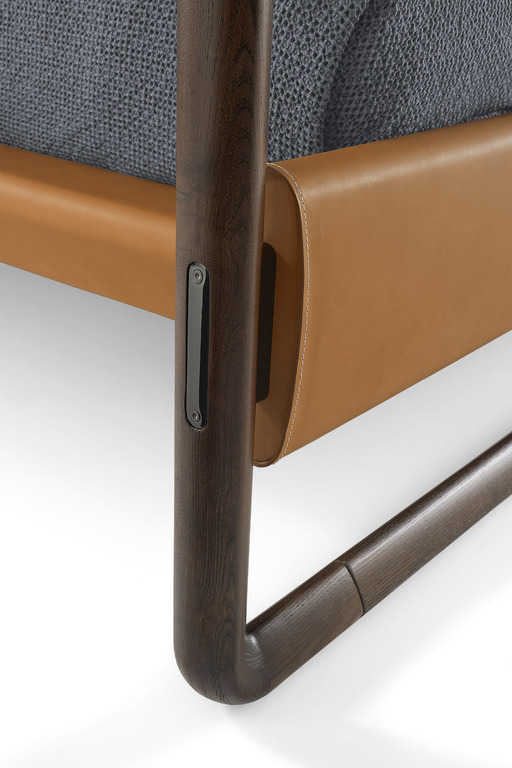Конструкция кровати Volare с балдахином из массива ясеня треугольного сечения и отделкой moka сужается к верху, постепенно становясь тоньше и легче. Изножье и каркас кровати изготовлены из тюльпанного дерева и полностью обтянуты кожей Cuoio Saddle Extra или Pelle Frau®, как и изголовье, которое изготовлено из массива бука с внутренними перекладинами из березовой фанеры и заполнено панелями из оргалита. Две мягкие и роскошные подушки, набитые полиэстеровой ватой, крепятся к изголовью кровати с помощью двух ремней из натуральной кожи. На передней стороне изголовья кровати ремни проходят через металлическую петлю с отделкой цвета серого металла и крепятся к спинке с помощью кнопок, также окрашенных в серый цвет и украшенных логотипом Poltrona Frau. Обивка выполнена из кожи Pelle Frau®, также двухцветной, или изысканной ткани с окантовкой из кожи или седельной кожи.