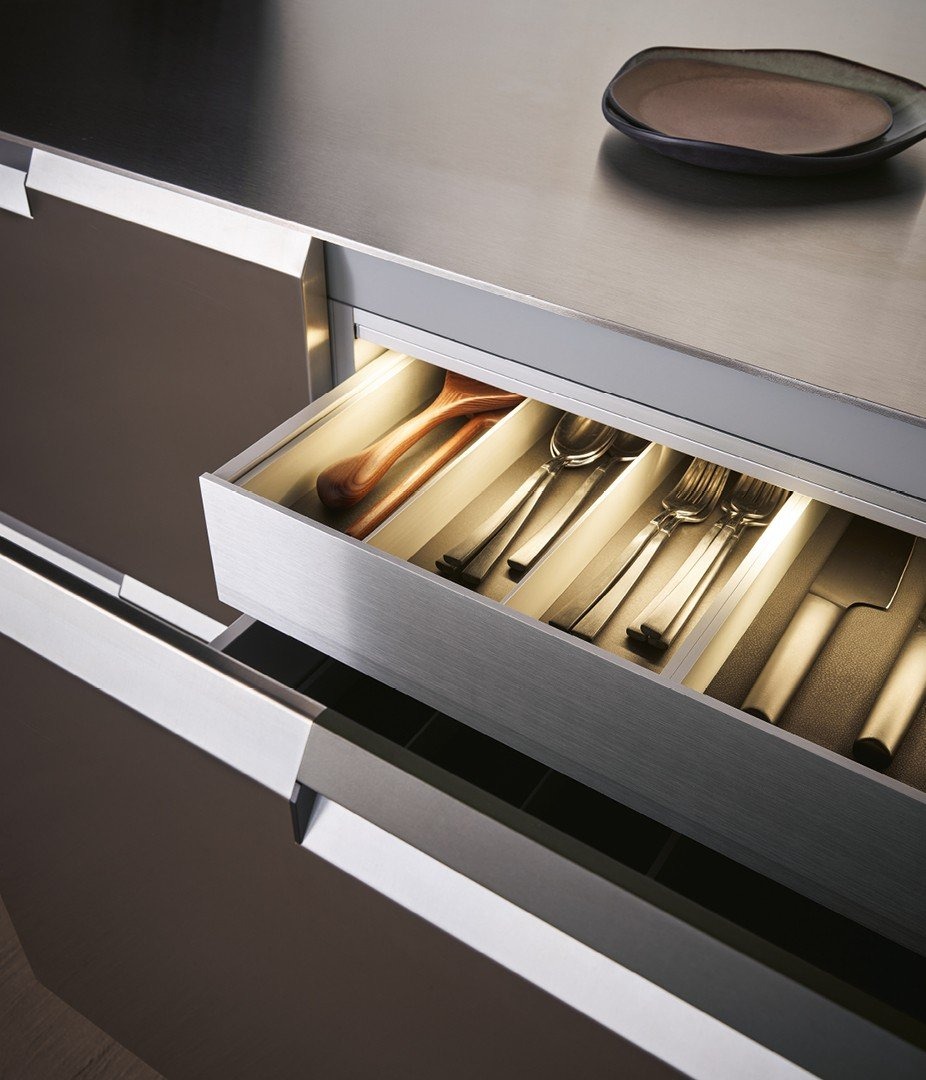Shape — это кухня с ручками, вдохновленная современным дизайном и функциональностью кухонь без ручек. Её особенность состоит в выдвижном профиле, внутри которого, собственно, и расположена ручка. Профиль, который в колоннах приобретает вид молдинга во всю высоту, в базовых шкафах может интегрировать ручку в центре двери или сбоку.