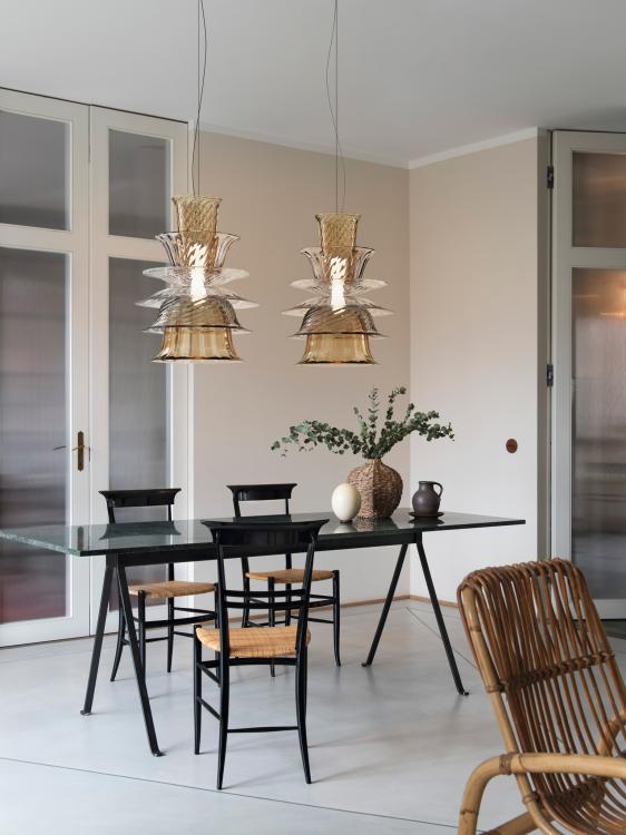 Элегантные подвесы вытянуты по вертикали, создавая эффектную игру света. Хрусталь ручной работы придает композиции яркость и гипнотическую глубину, сохраняя традиции венецианского стеклоделия. Идеален для премиальных интерьеров, где важны детали и авторский подход.