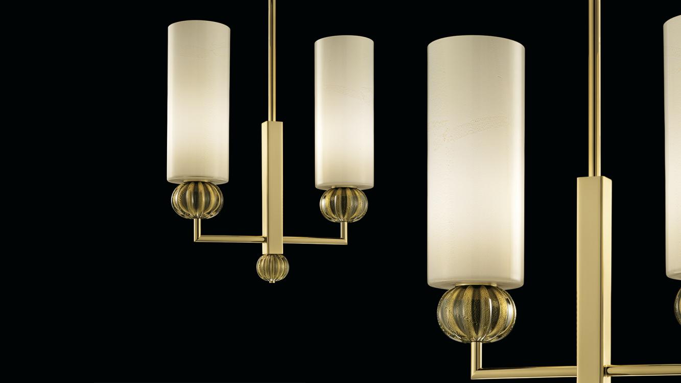 Коллекция Gallia — это гимн чистоте линий и благородству пропорций. Светильник выполнен в виде сферического элемента, подчеркнутого мягкими переливами рассеивателя opaline бежевого оттенка с золотыми вкраплениями. Такое решение создает эффект теплого, почти живого свечения, напоминающего солнечные блики на античном мраморе. Доступные вариации — с двумя или четырьмя лампами, а также с регулируемой высотой — позволяют адаптировать модель под любые пространства: от просторных гостиных до уютных столовых.