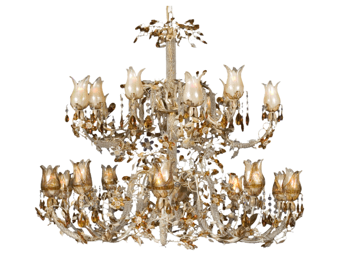 люстра из кованого железа на 20 ламп с прозрачным и цветным богемским хрусталем, муранским стеклом и прозрачными жемчужными вставками