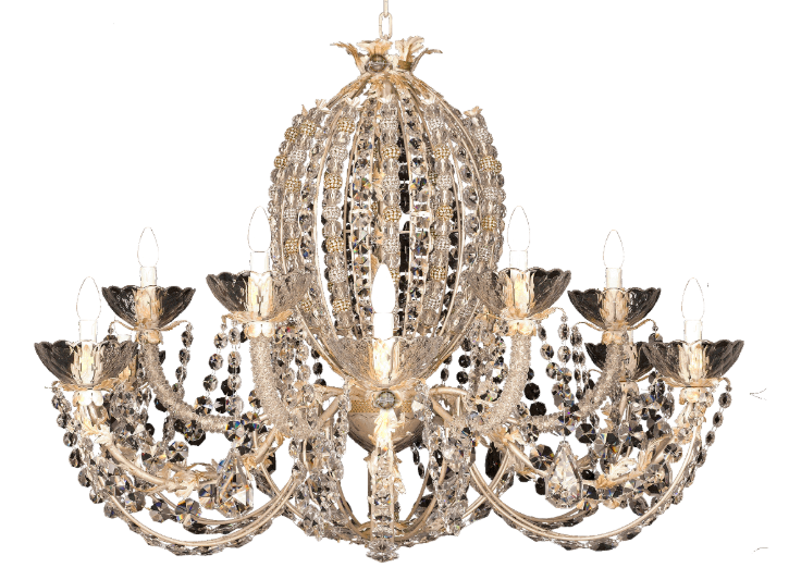 Люстра: высота 90 см, ширина 125 см; вес 41 кг (90 фунтов); 12 лампочек; цоколи E14 или E12; мощность лампочек не более 40 Вт.