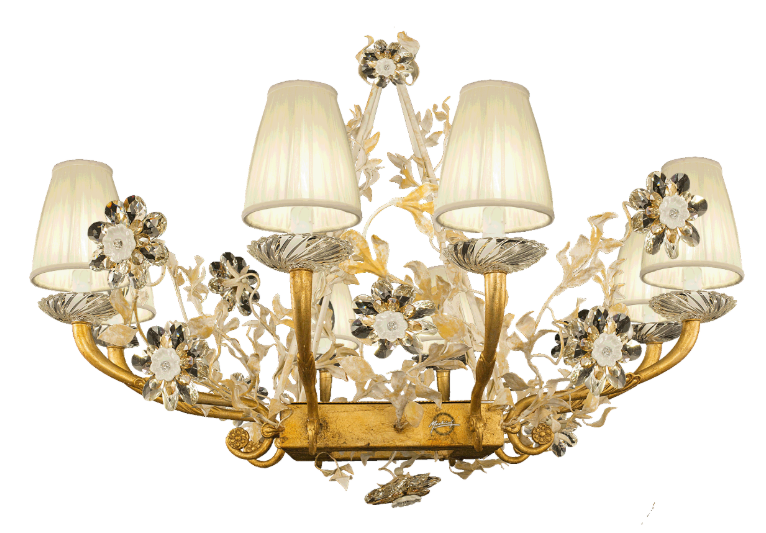 люстра из кованого железа и латуни с прозрачным и цветным богемским хрусталем и фарфором, шелковыми абажурами