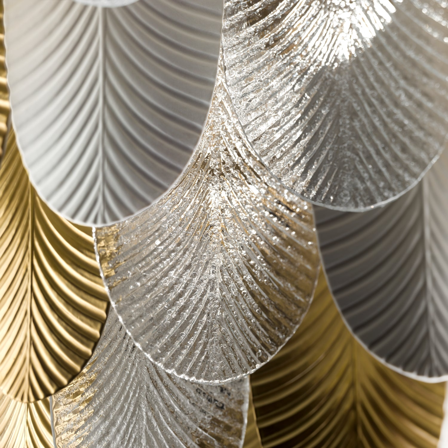Украсьте свой дом этой замечательной люстрой, вдохновленной стилем ар-деко и павлиньим оперением. Конструкция выполнена из латуни и поддерживает ряды плафонов в форме перьев из позолоченного фарфора, белого хрустящего фарфора и выдувного муранского стекла, которые экранируют свет от 18 ламп, создавая потрясающий конечный эффект. Это произведение искусства излучает завораживающее очарование и является великолепным примером изысканного мастерства Villari. Великолепная люстра, которая придаст изысканности и драматизма изысканному дому.