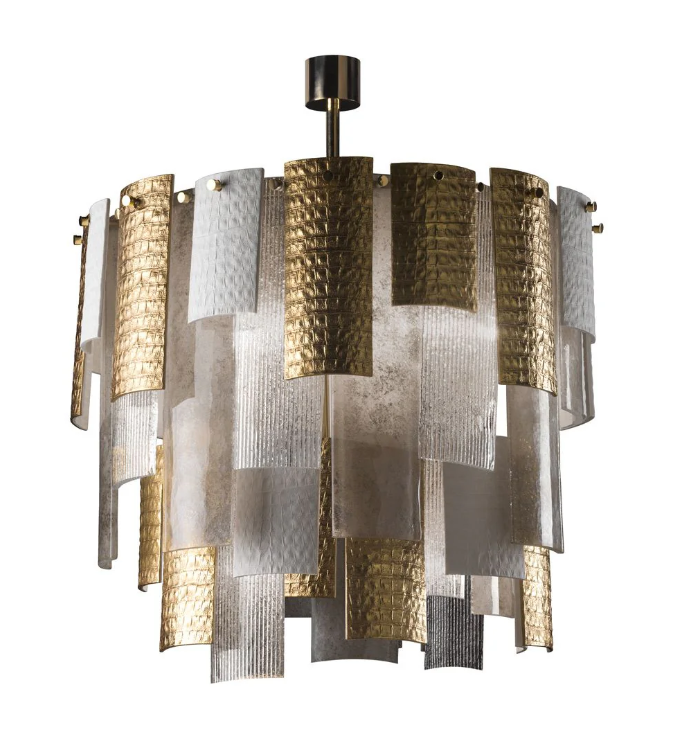 Сочетая изысканный дизайн с утонченным мастерством исполнения, эта люстра представляет собой шедевр скульптурного очарования, выполненный из различных стеклянных и фарфоровых текстурированных панелей, и придаст вашему дому очарование в стиле ар-деко. Его конструкция была вдохновлена песней «The wall», поскольку на самом деле он построен по кирпичику, как настоящая стена. Латунная конструкция поддерживает каскад панелей из матового муранского стекла с глубокими рельефными вертикальными канавками и фарфоровых панелей ручной росписи из 24-каратного золота с узором в виде крокодиловой кожи, которые придают всей композиции роскошный и в то же время органичный вид. 9 лампочек под ними ярко светят, создавая превосходный рассеянный свет. Эта современная скульптурная люстра создает атмосферу шика и дополнит любой интерьер в современном стиле.