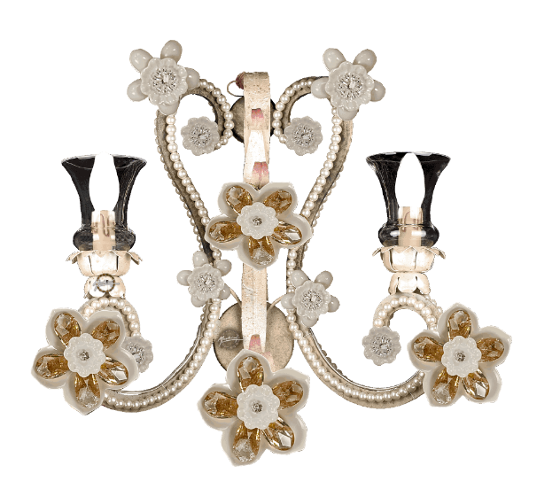 настенный светильник из кованого железа с двумя лампочками, украшенный венецианским хрусталем янтарного цвета, чешским жемчугом и белыми фарфоровыми цветами