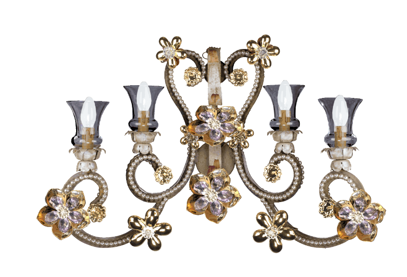 Настенный светильник из кованого железа с 4 лампочками, украшенный венецианским хрусталем янтарного цвета, чешским жемчугом и белыми фарфоровыми цветами