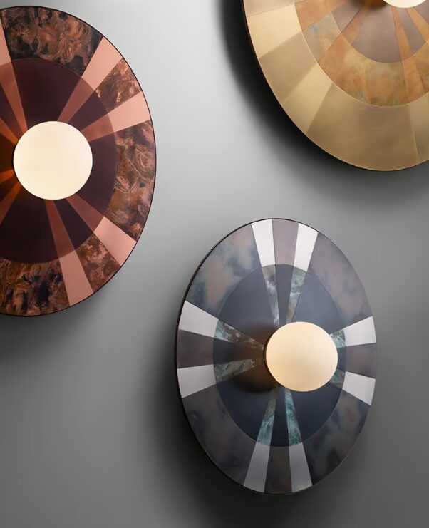 В коллекции Caleide гармонично вплетены свет и металл. Каждая лампа приобретает форму благодаря уникальным геометрическим композициям Сталь, латунь и медь чередуются в оксидированной и матовой отделке, обогащенной игрой форм, которые возвышают тонкий круглый металлический лист