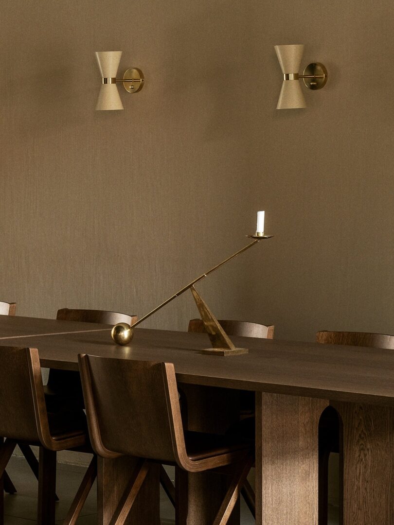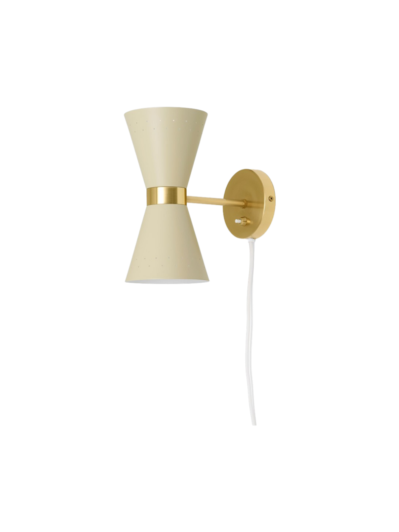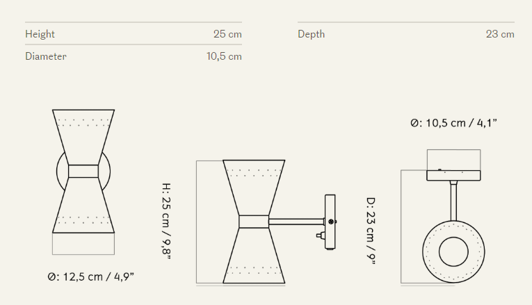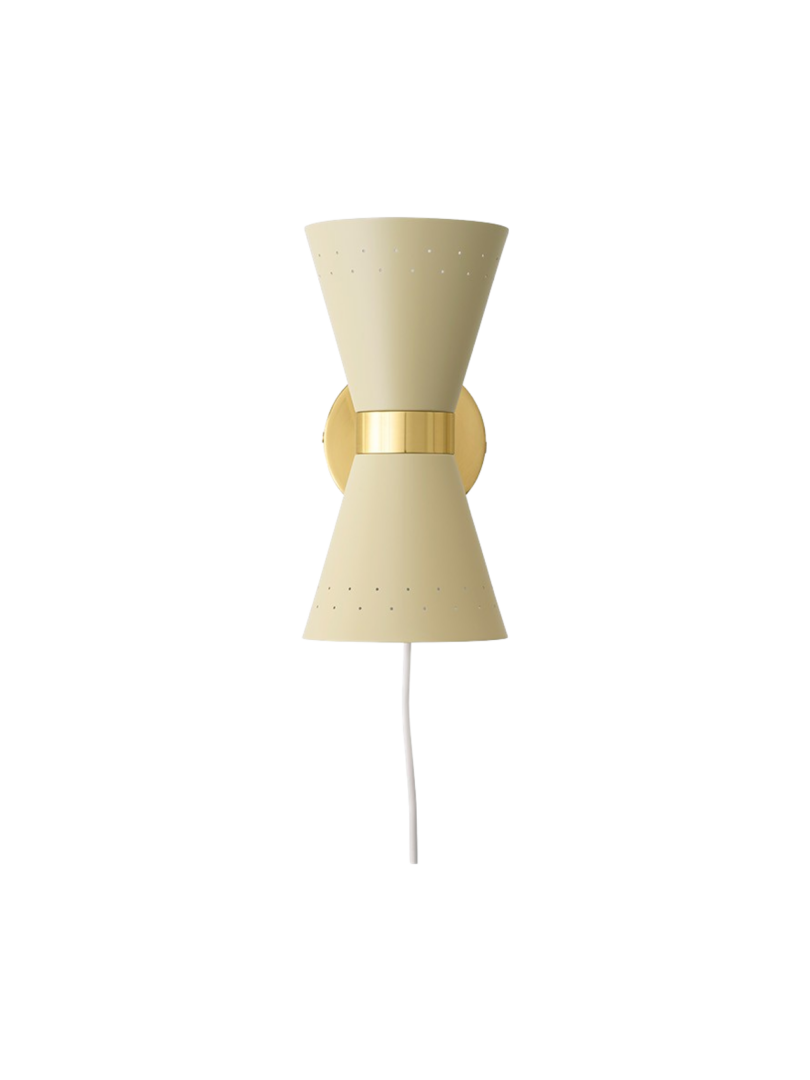Настенный светильник, один из трех вариантов дизайна, отличается массивной латунной лентой, на которой закреплен металлический абажур конической формы, рассеивающий свет в двух направлениях. Небольшие отверстия в абажуре позволяют свету проникать внутрь.