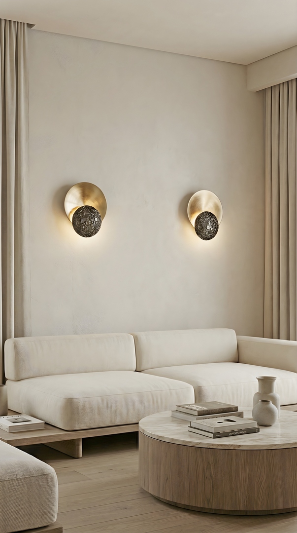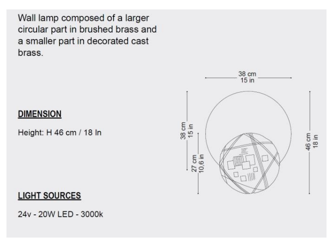 Настенный светильник состоит из большей круглой части из матовой латуни и меньшей части из декорированной литой латуни.