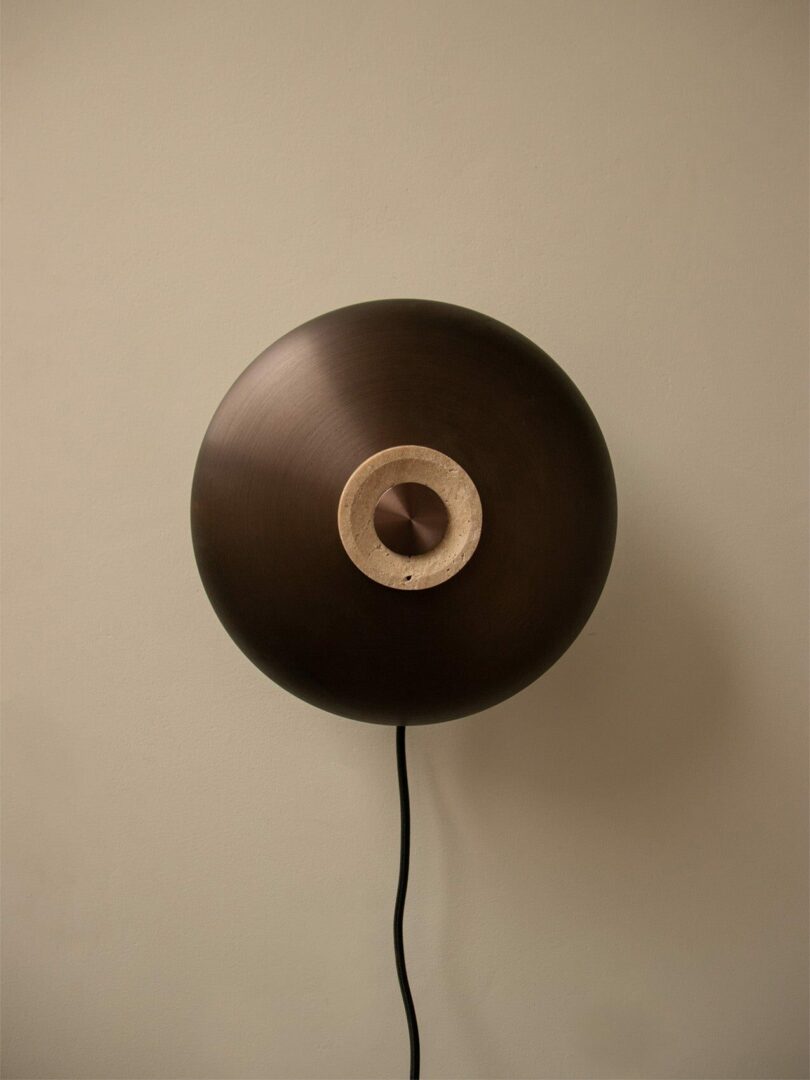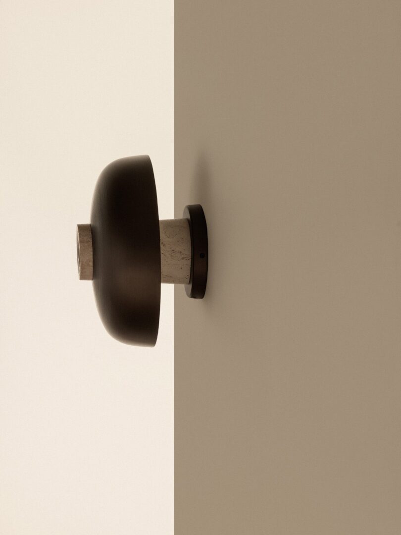 Настенное крепление светильника изготовлено из необработанного травертина, которому придана коническая форма с естественными дефектами, подчеркивающими красоту органических текстур. Изогнутый абажур, напротив, изготовлен из анодированного бронзированного алюминия с гладкой поверхностью, придающей ему полированный оттенок. Лампа оснащена опаловым рассеивателем, обеспечивающим равномерное рассеивание света и теплое рассеянное свечение. Лампа оснащена интуитивно понятным регулятором яркости, который позволяет легко регулировать яркость, а также шнуром без переключателя, что обеспечивает эстетическую чистоту, и возможностью подключения к проводам для более простой установки.