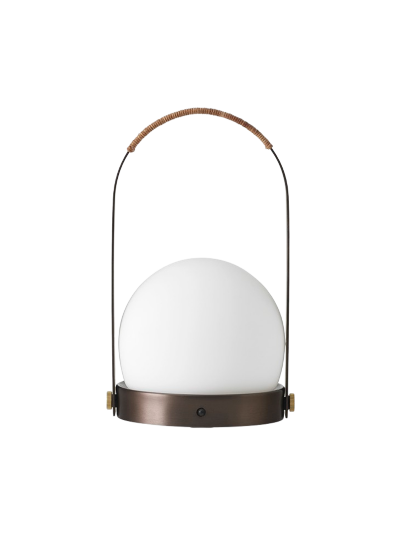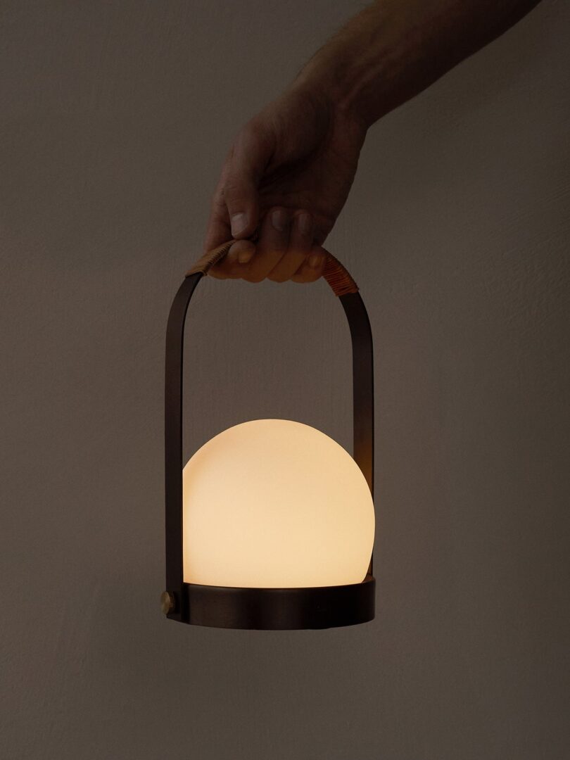 Портативная светодиодная лампа Carrie излучает теплый свет на своем гладком металлическом основании, напоминающем корзину. Она доступна в двух элегантных вариантах исполнения — из матовой латуни и бронзы с бронзовым покрытием. Ручка из коричневого металла в последнем случае обшита мягкой, но прочной кожей.