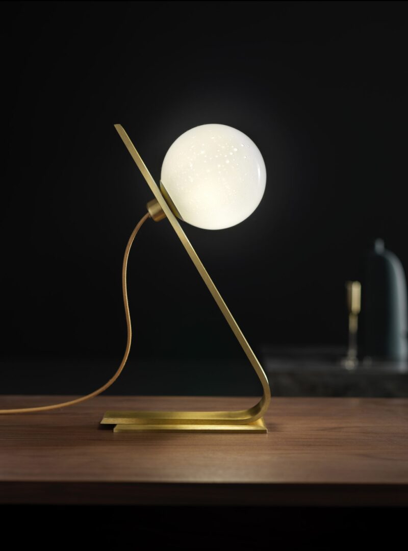 Массивная латунная пластина. Фрезерованная и изогнутая. Молочно-белое стекло с отделкой “пулегозо”.