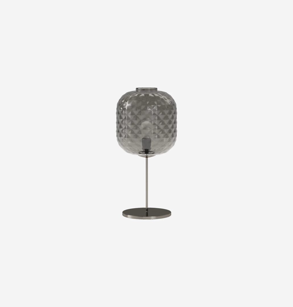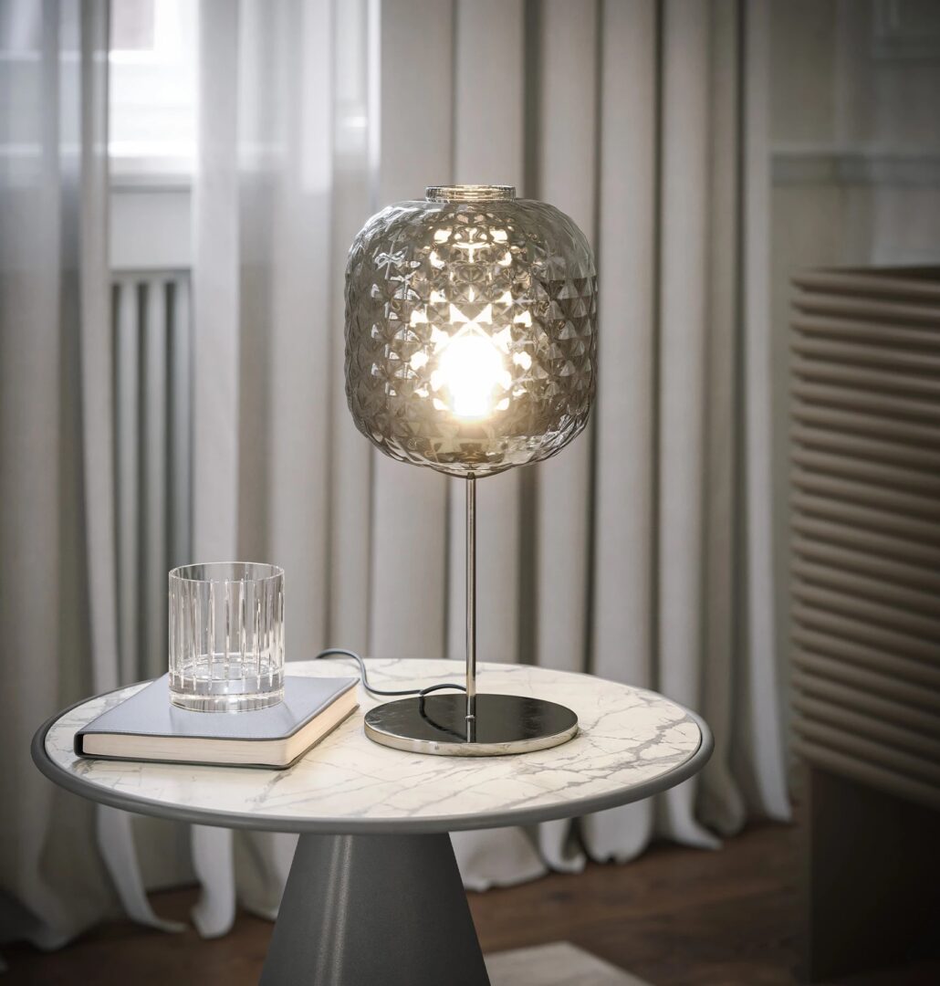 Лампа-фонарь характеризуется трехмерной ромбовидной обработкой дымчатого стекла, выдуваемого ртом; эффект стеганого одеяла дает жизнь игре света и отражения, делая среду sofi липкой и очаровательной. Доступен в подвесной или настольной версии.